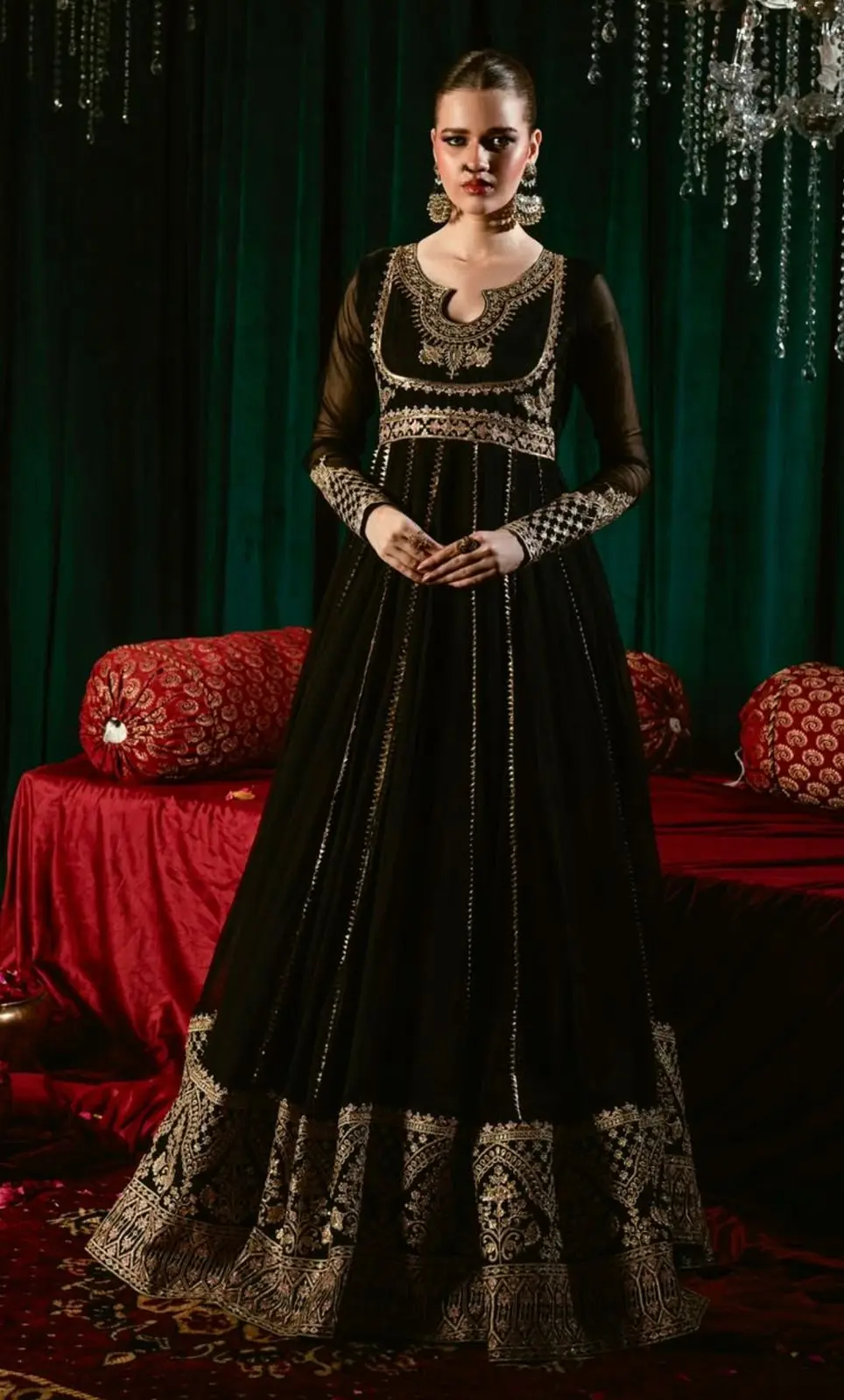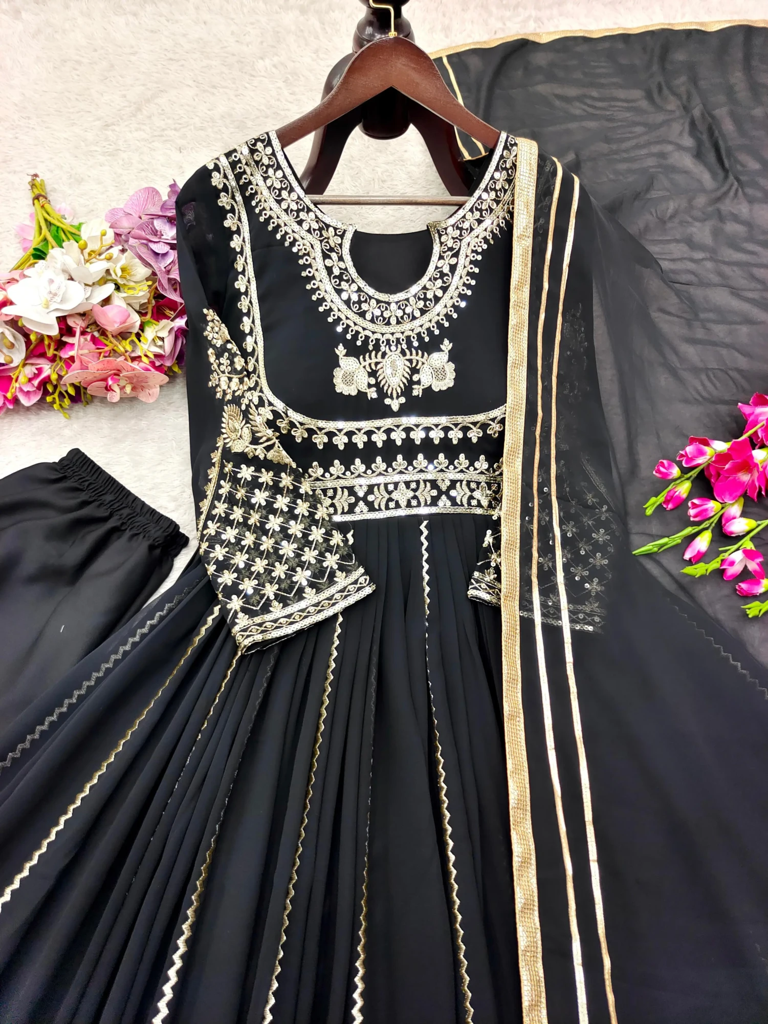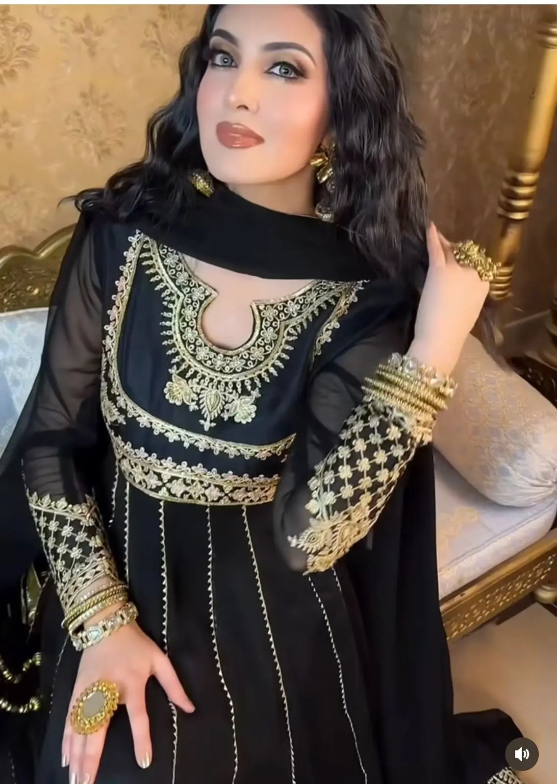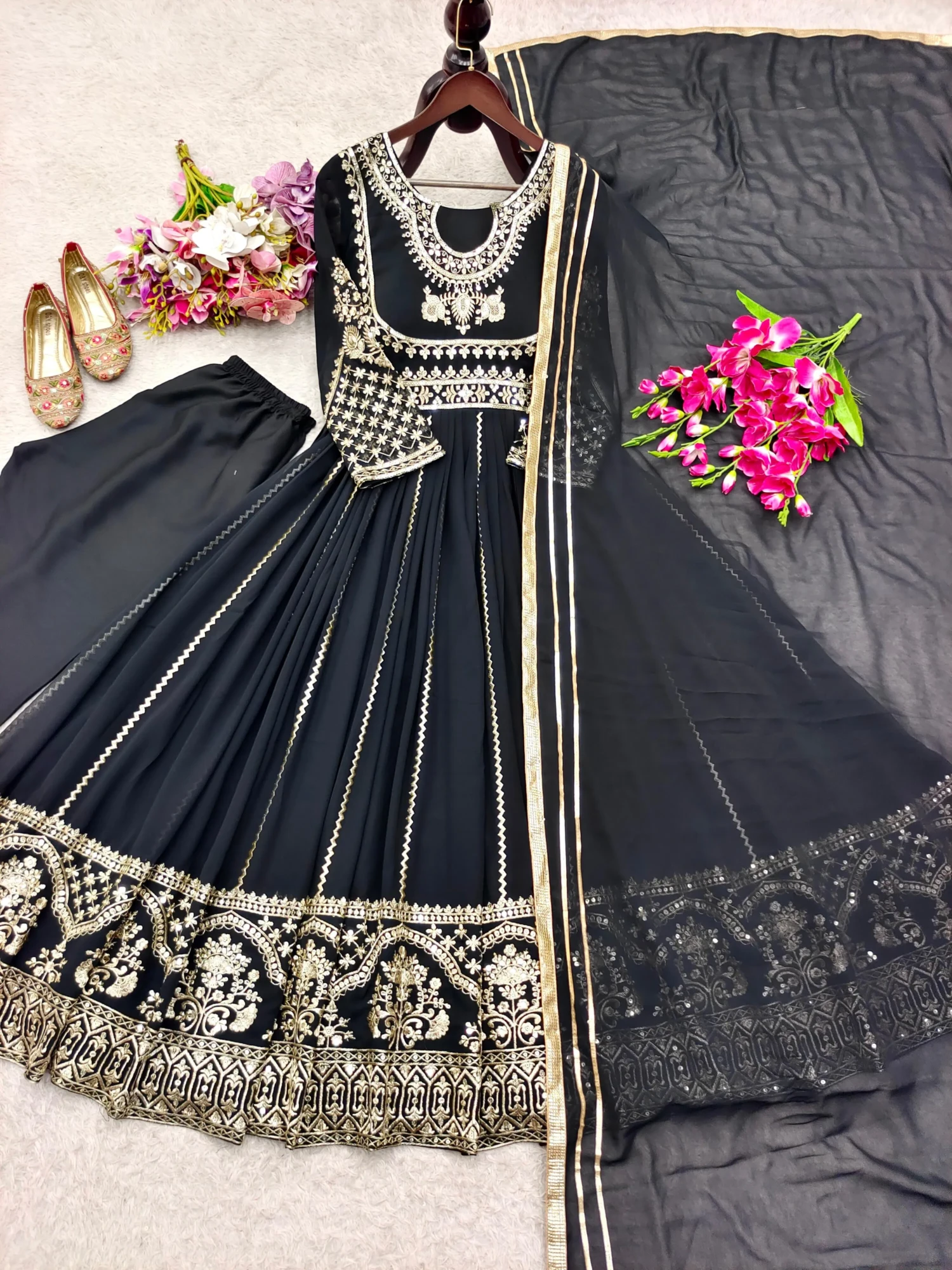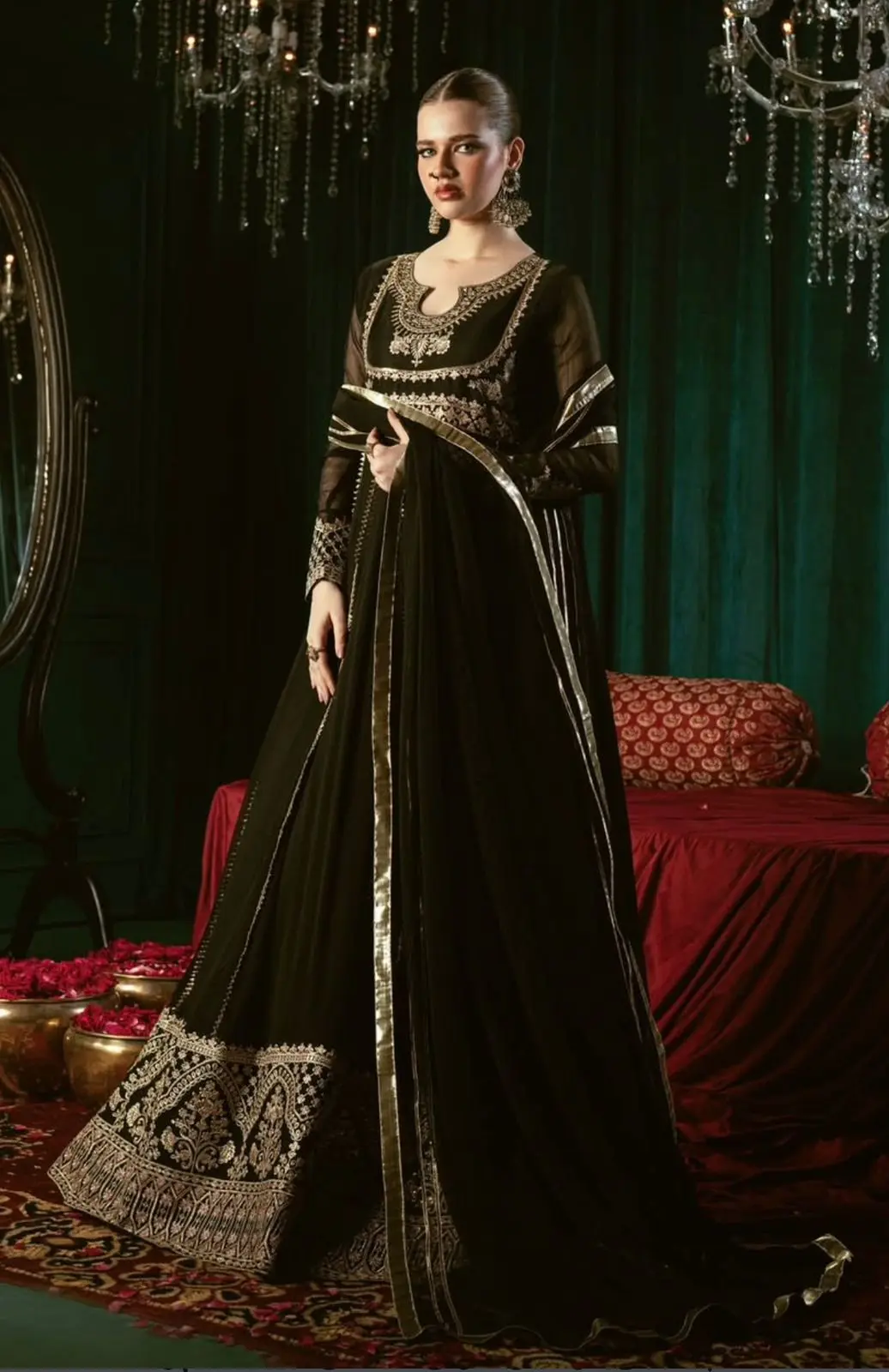 Introducing the WW-1229 Designer Party Wear Set, crafted from premium fox georgette with elegant embroidery and 5 mm sequence (siqwans) work. This ready-to-wear set includes a stunning full-length gown, matching pant, and dupatta, designed for weddings, receptions, festive occasions, and special parties.