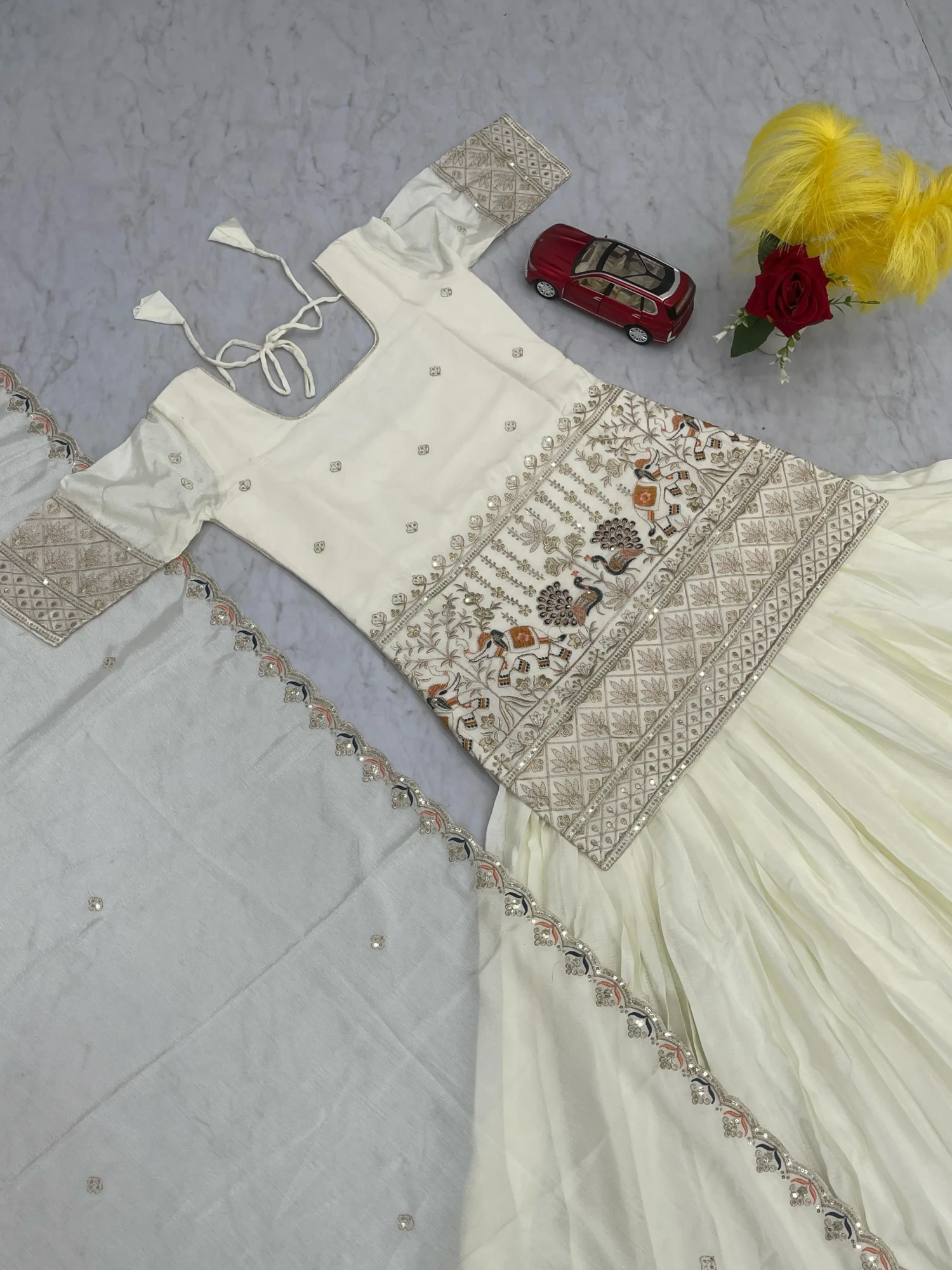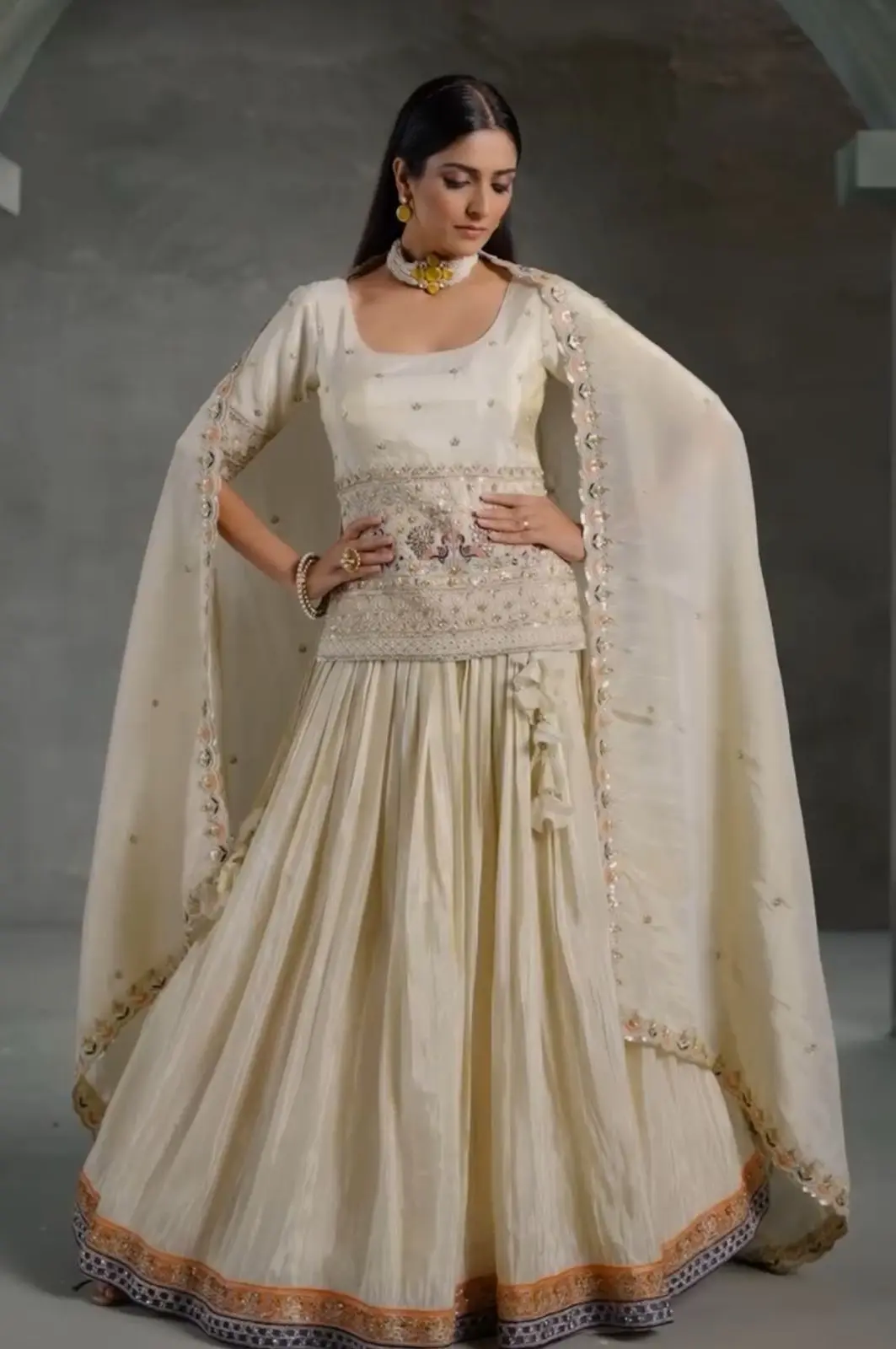 Step into festive elegance with this premium Crop Top–Lehenga–Dupatta set crafted from soft chinon fabric. Designed with intricate embroidery thread and sequence work, this outfit blends modern flair with traditional charm. Perfect for weddings, festive occasions, and special celebrations, it offers comfort, style, and sophistication in one ensemble.