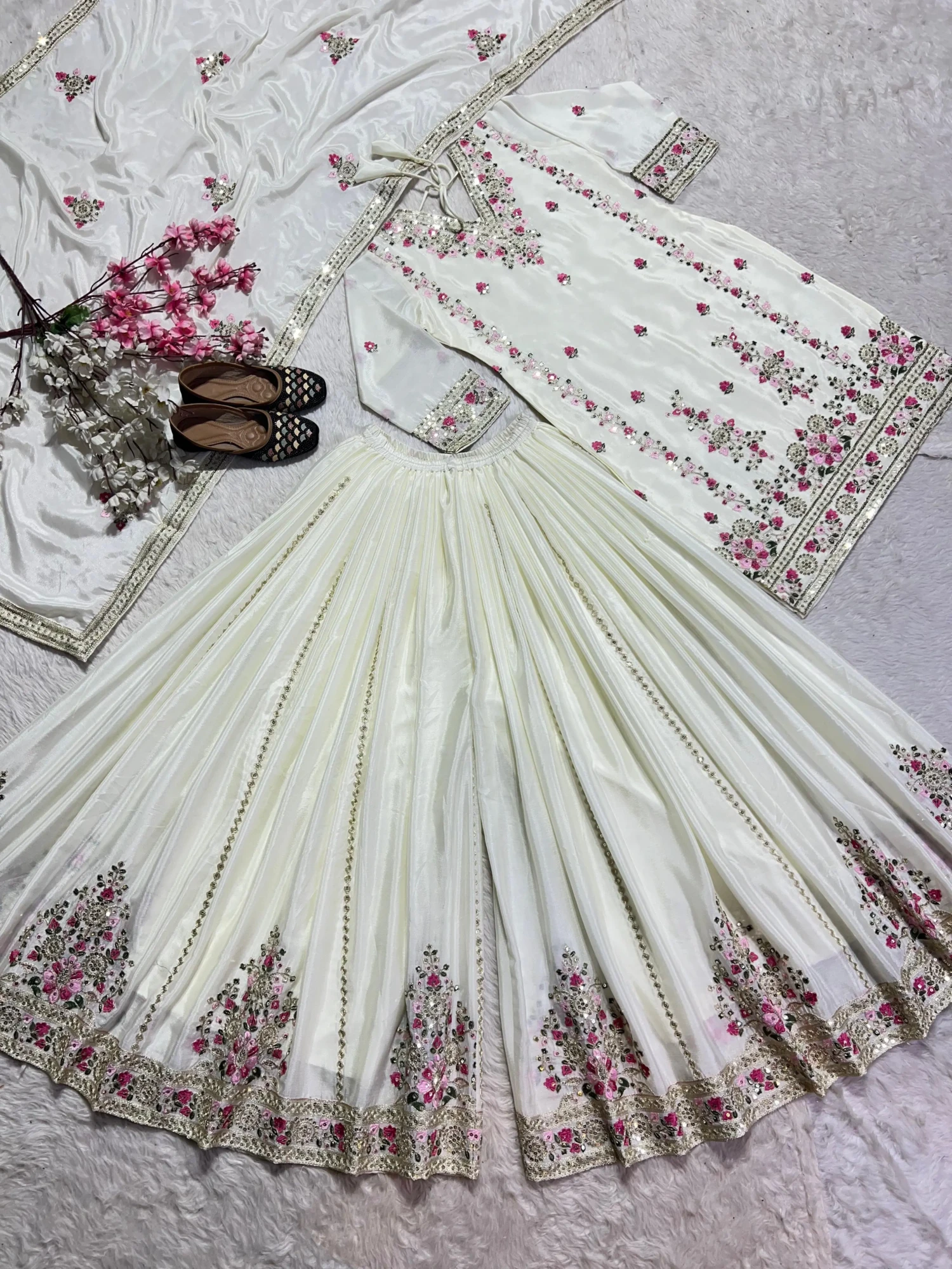 The matching Plazzo is fully stitched in pure heavy Chinon silk, with embroidery coding sequence work and micro cotton lining, measuring 40-41 inches in length. The 2.30-meter Dupatta completes the look with intricate embroidery and a four-side lace border. Weighing 950g, this elegant set is ideal for festive events, parties, and cultural celebrations.