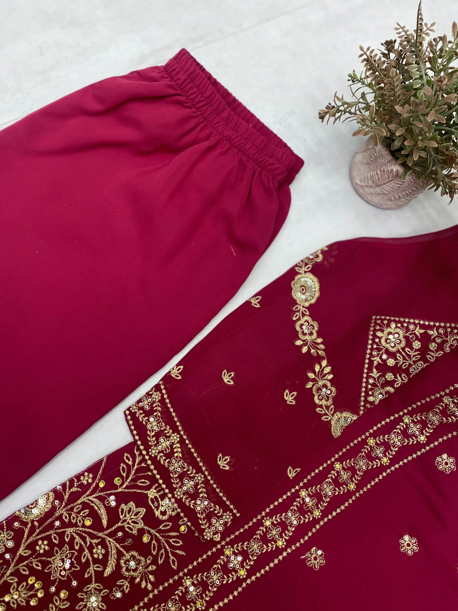 Add elegance to your ethnic collection with this exclusive designer suit set (Code: BE-383), crafted from high-quality faux georgette fabric. This three-piece ensemble features a fully stitched top, pant, and dupatta — adorned with sequin embroidery and delicate diamond work, making it perfect for festive and formal occasions.