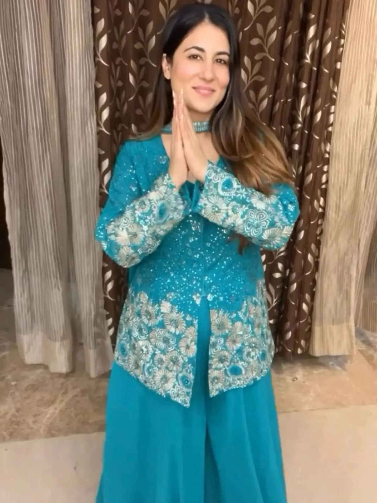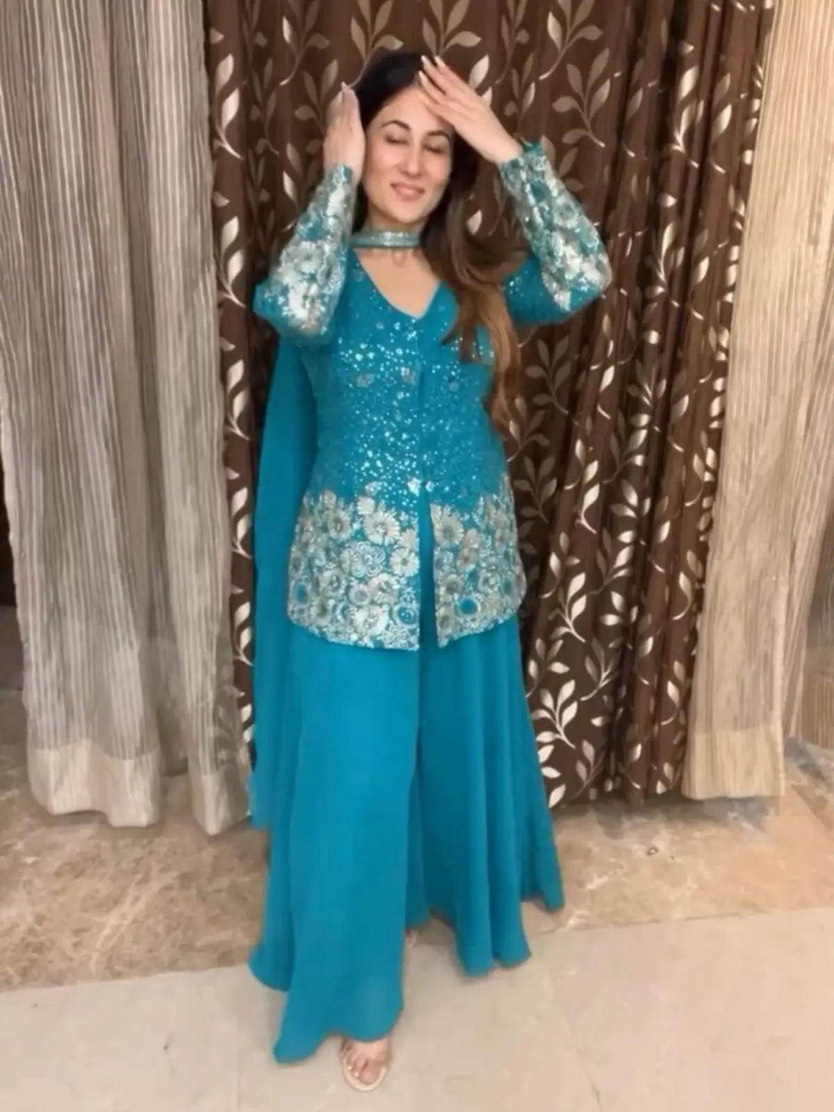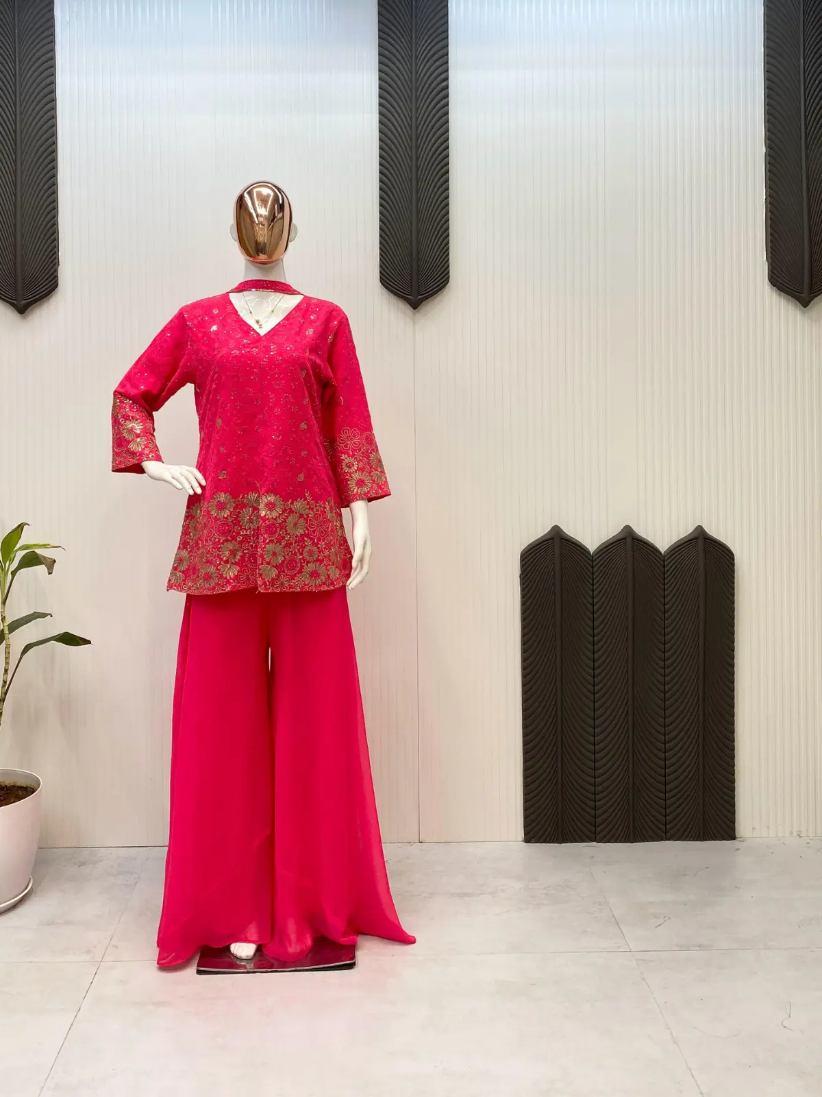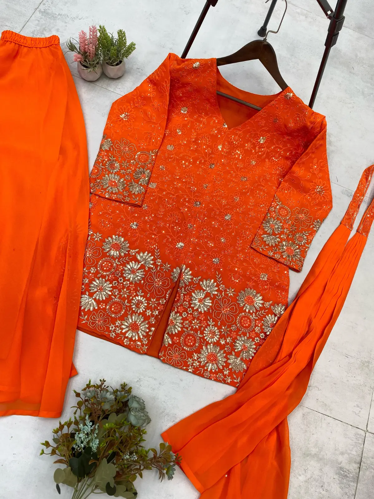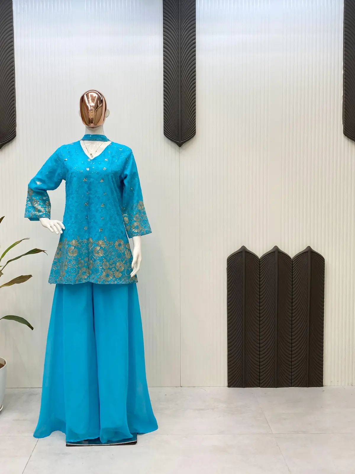 Elevate your festive and party wardrobe with this elegant 3-piece designer set featuring a beautifully embroidered top, flowing circular palazzo, and a delicately detailed dupatta. Crafted in premium Georgette fabric, this outfit combines comfort, style, and finesse.
