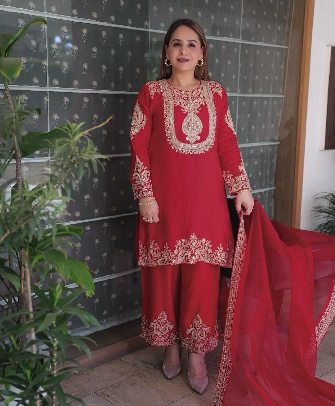 Designer Roman Silk Kurti Pant Dupatta Set with Embroidery & Sequins – New Launch