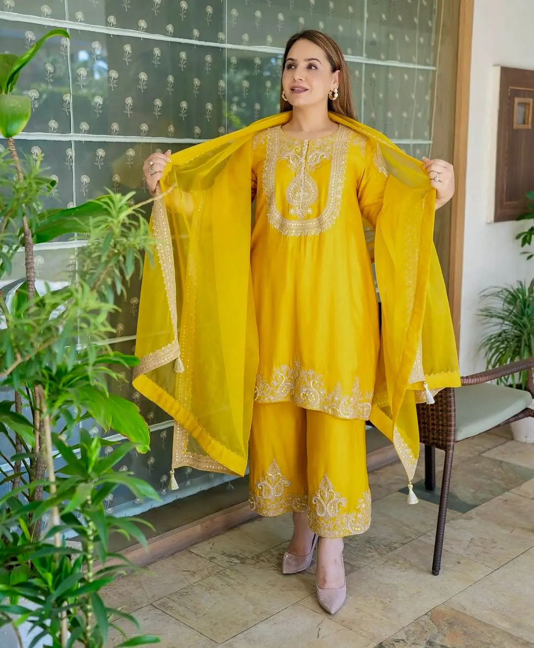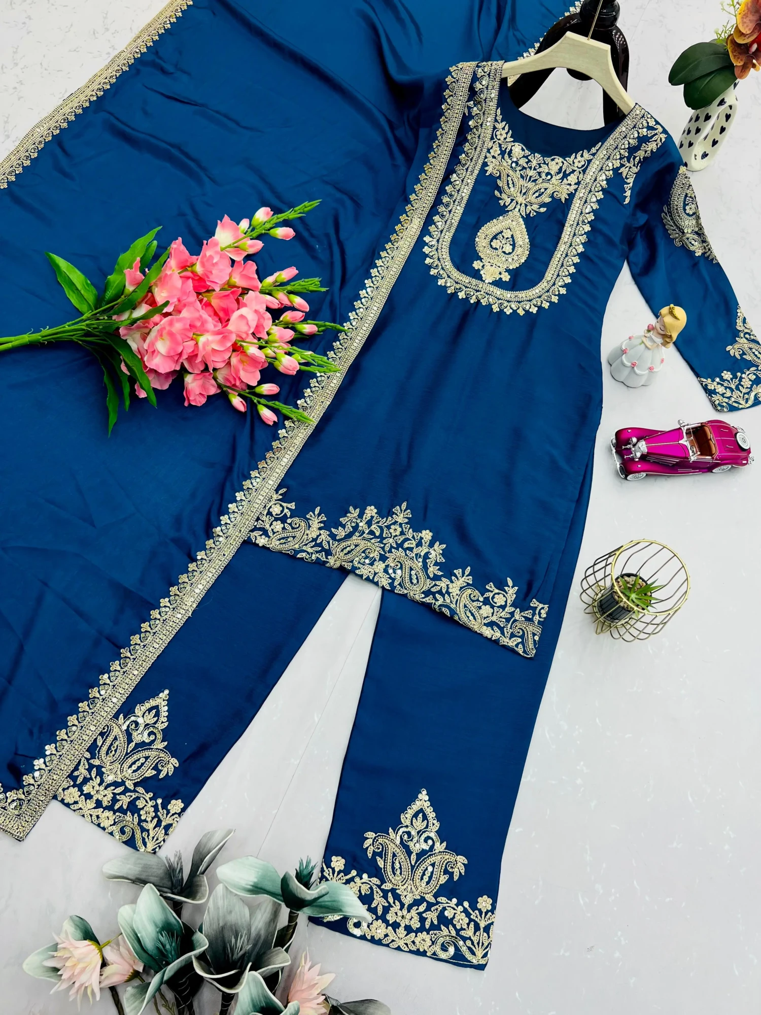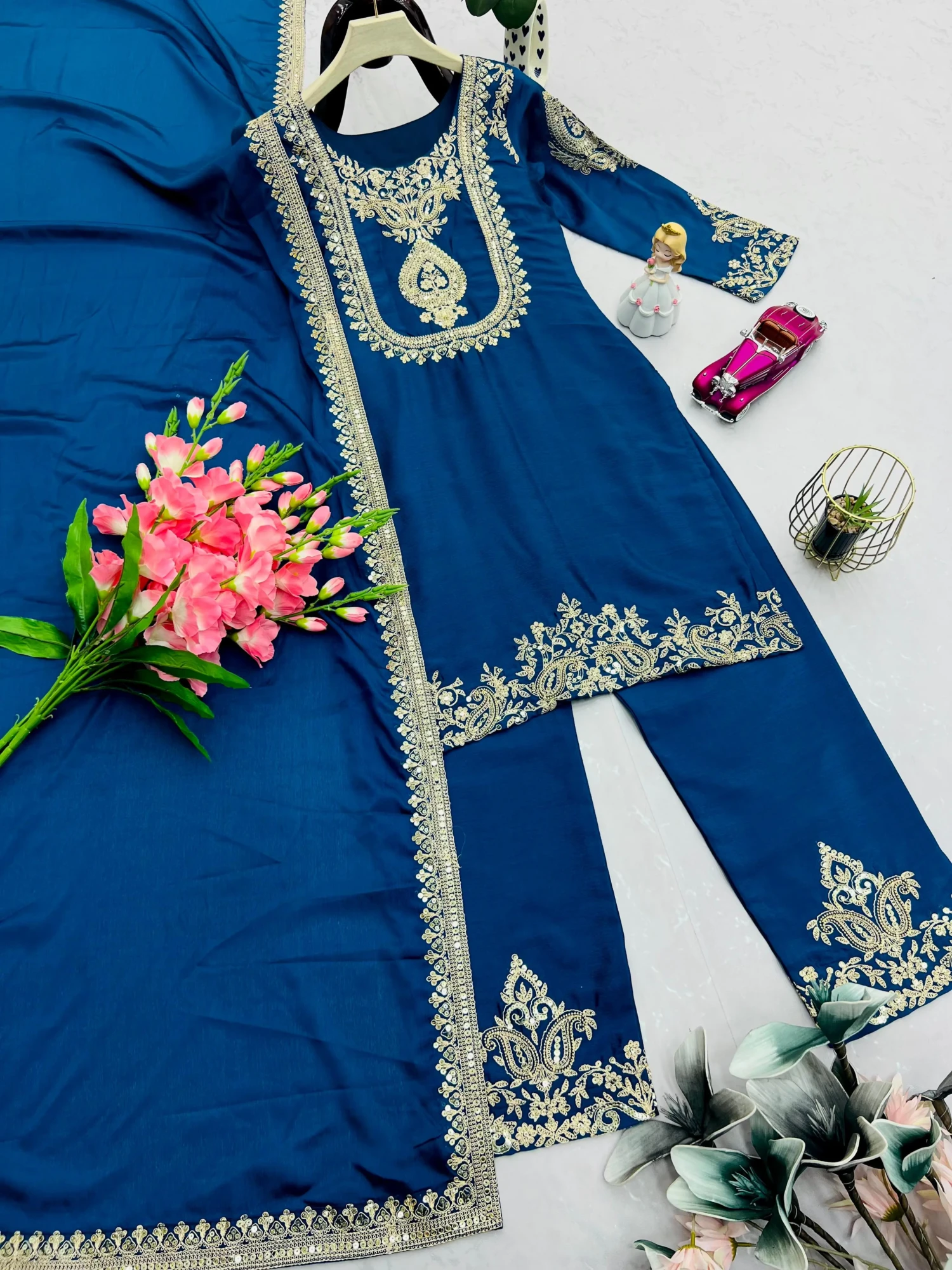 Exclusive Chinon Suit Set with Sequins Embroidery – Kurti, Plazzo & Organza Dupatta