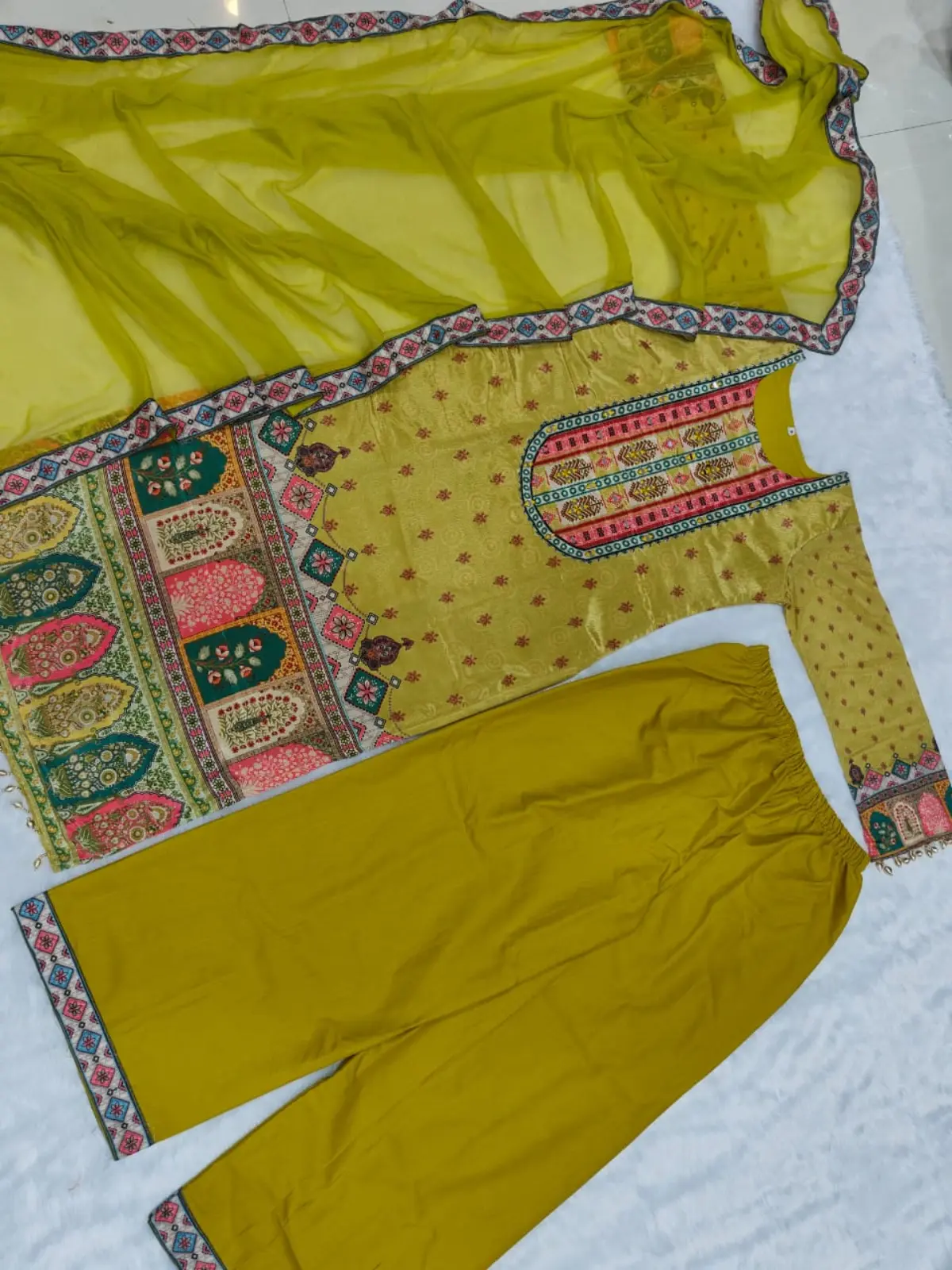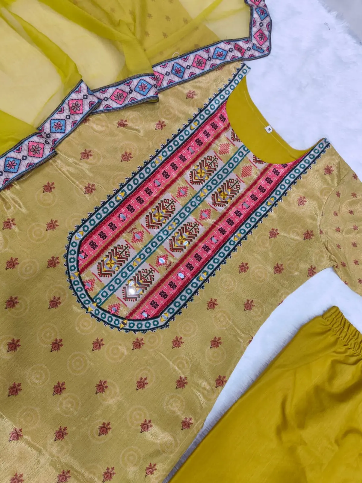 • Work: Traditional Jaypuri Print with Fancy Embroidery, Original Mirror Work, and Moti Lace