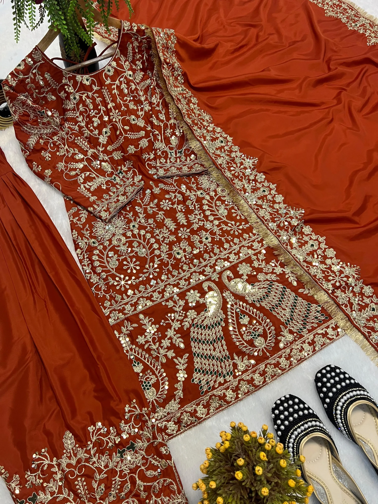 Add a touch of regal elegance to your wardrobe with the MF-475 Designer Long Punjabi Suit Set. This exquisite ensemble is crafted from premium Heavy Natural Crepe Silk, embellished with rich 5mm sequins embroidery work for a luxurious appeal. The set includes a long top, farshi salwar, and a beautifully embroidered dupatta, offering a perfect blend of tradition and style.
