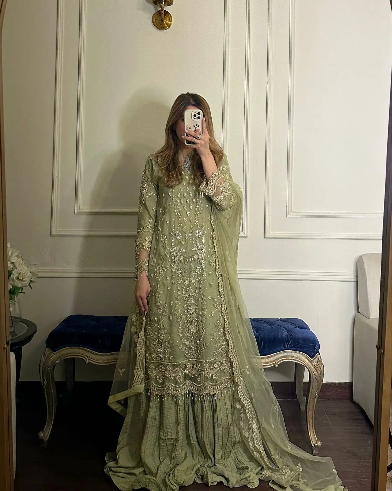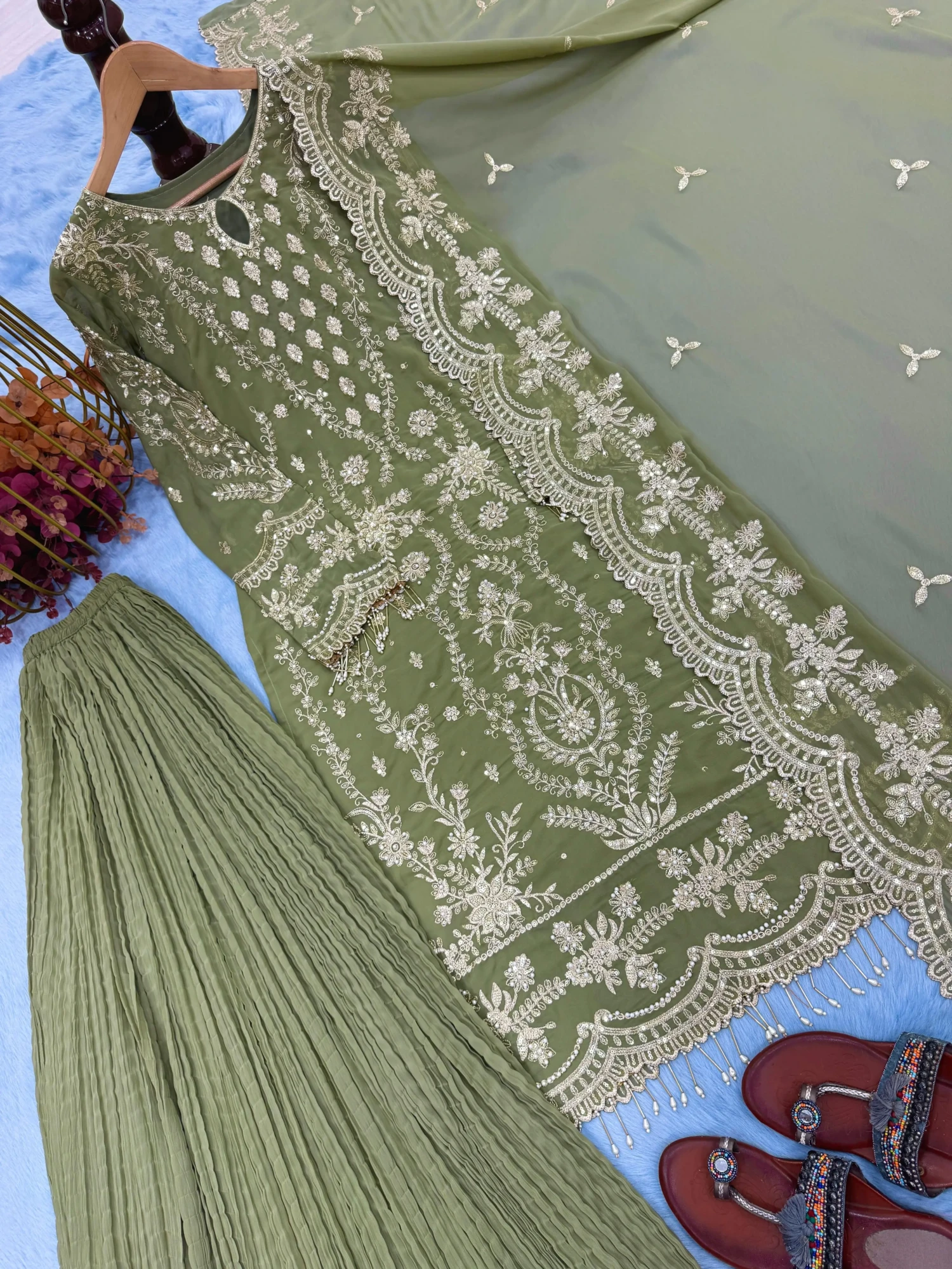 • Work: Heavy embroidery with 5 mm sequence and rivet moti work