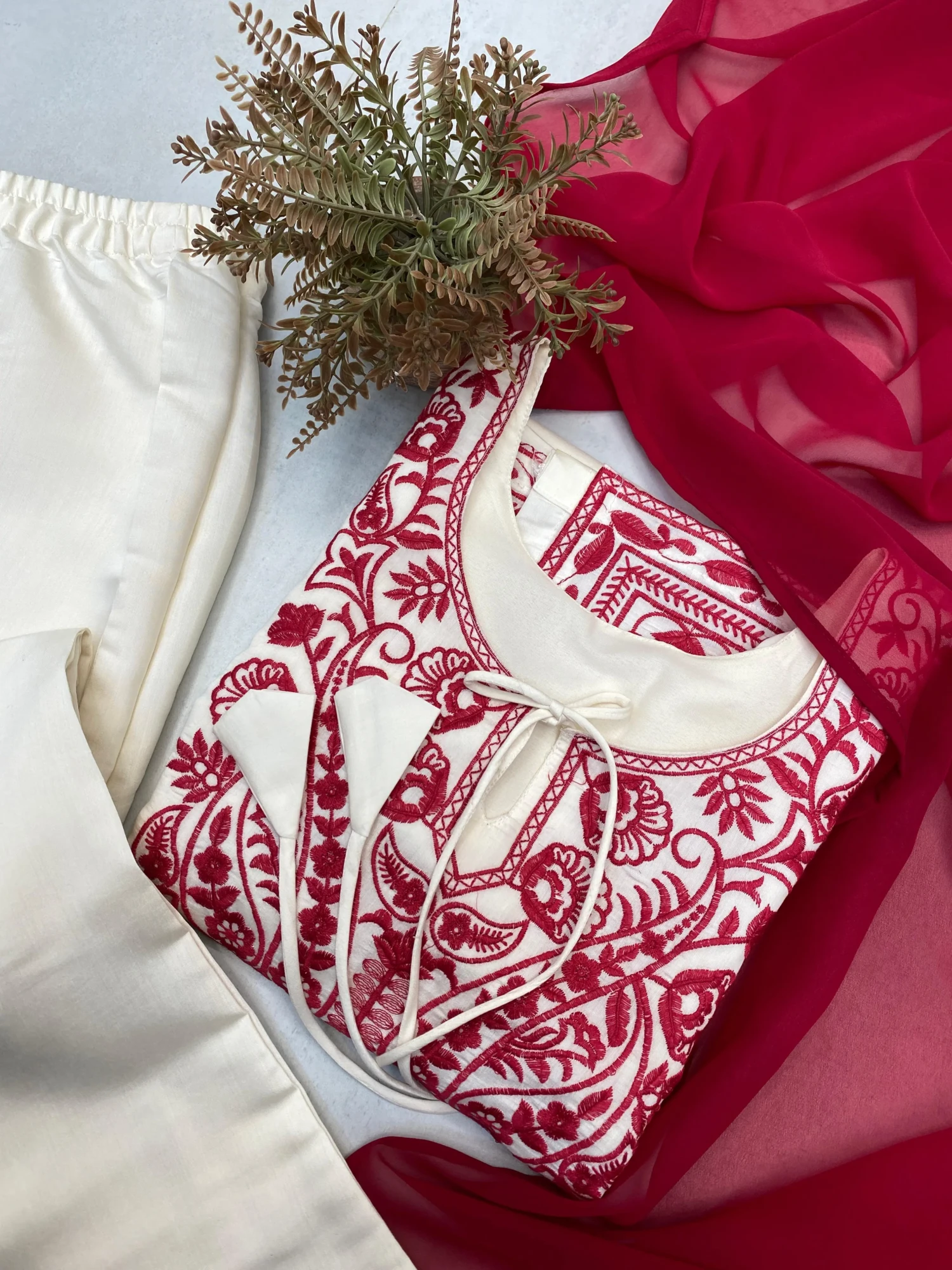 French Crap Embroidered Top-Plazzo Dupatta Set