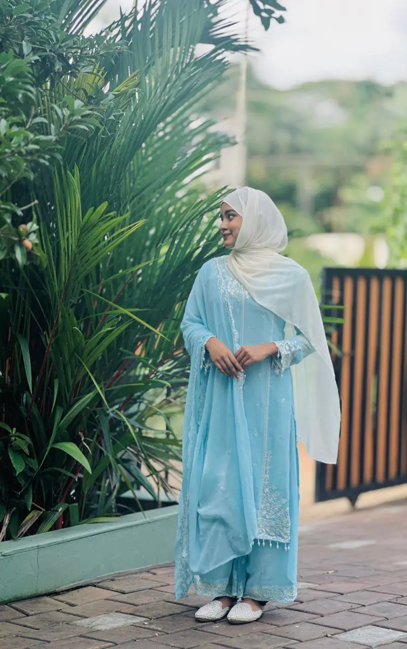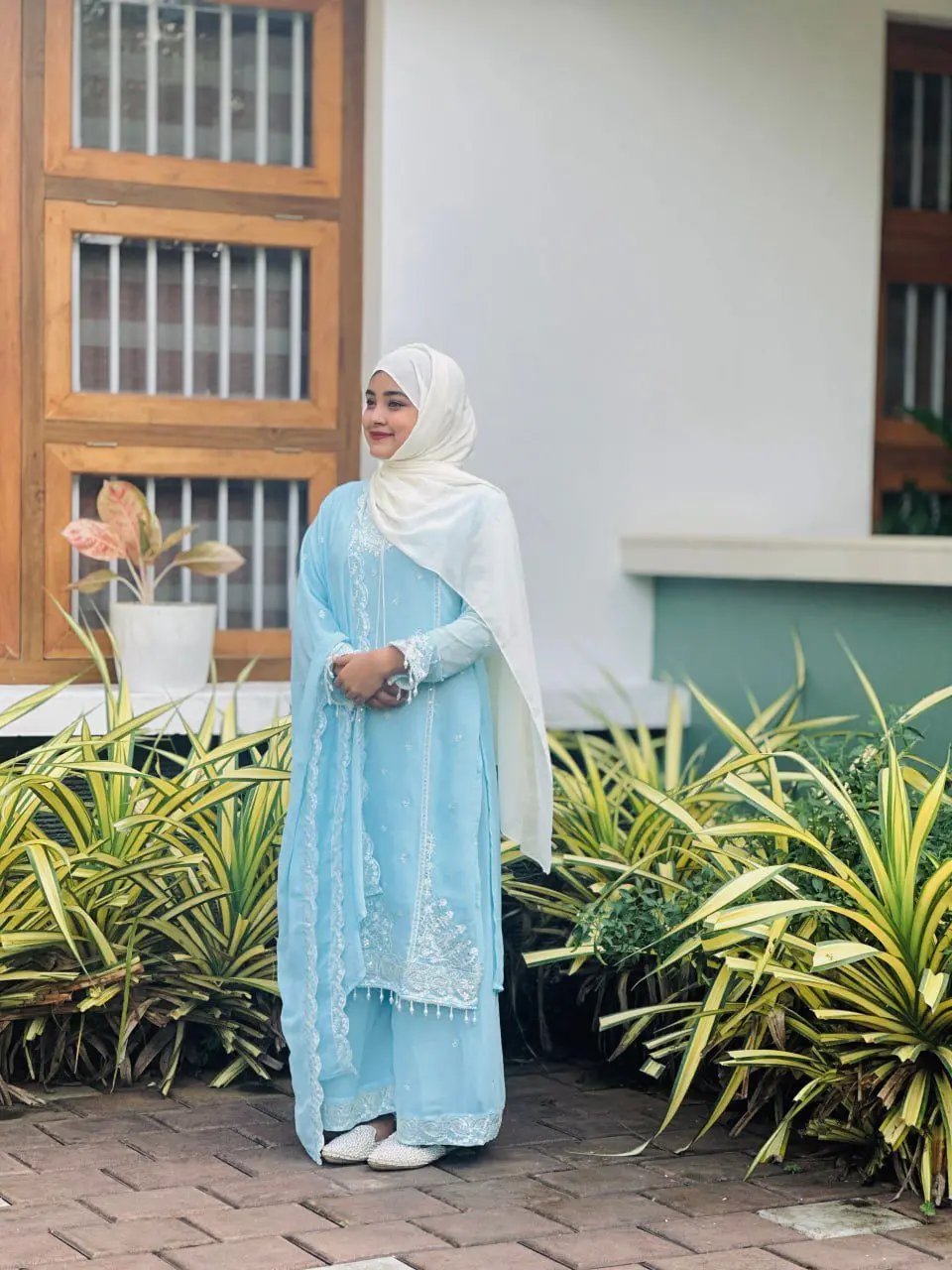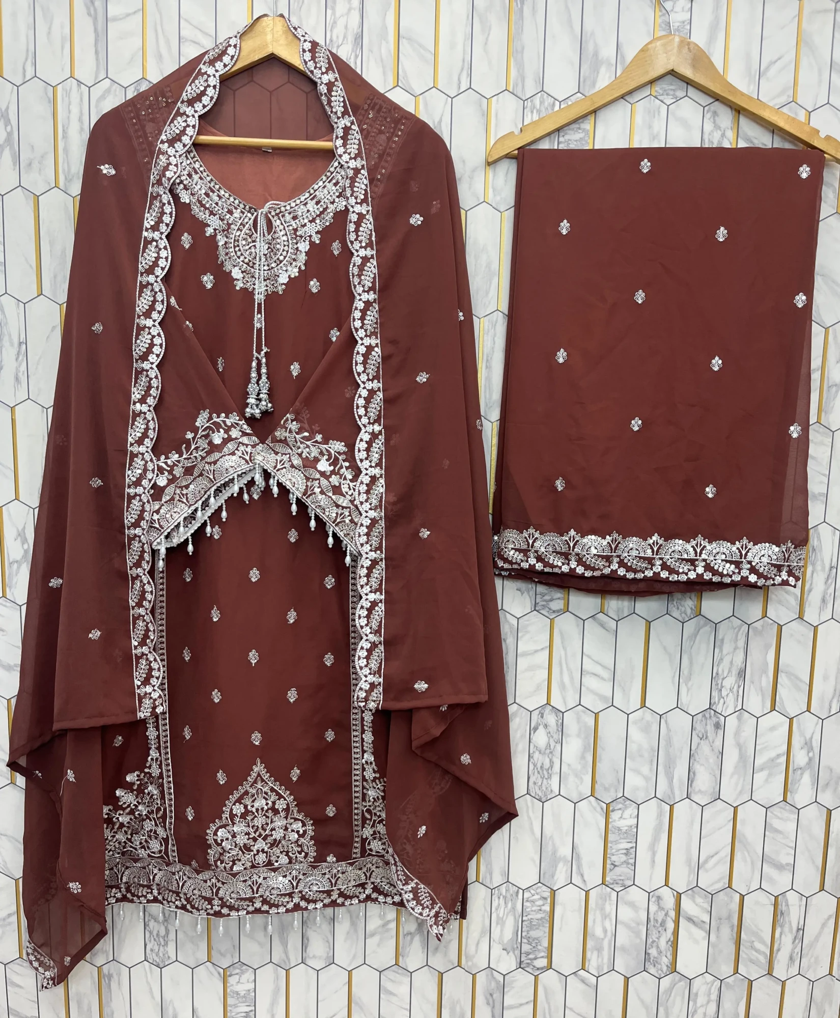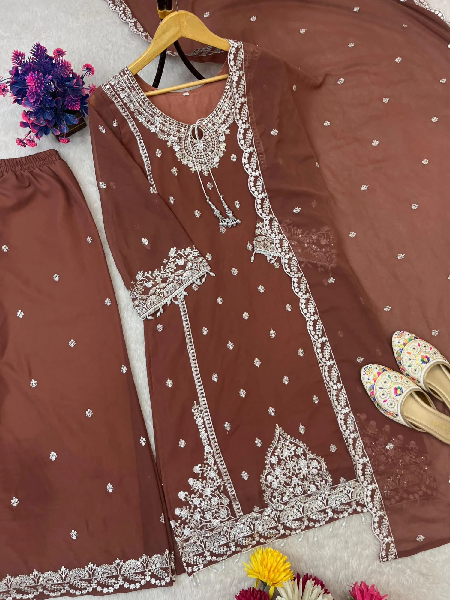 Presenting a premium designer sequence embroidery suit set featuring a fox georgette top with fancy latkan detailing, matching plazzo, and dupatta. This three-piece outfit is crafted with high-quality fabric and intricate embroidery sequence work, offering both elegance and comfort. Fully stitched and ready to wear, this set is perfect for weddings, parties, receptions, and festive occasions.