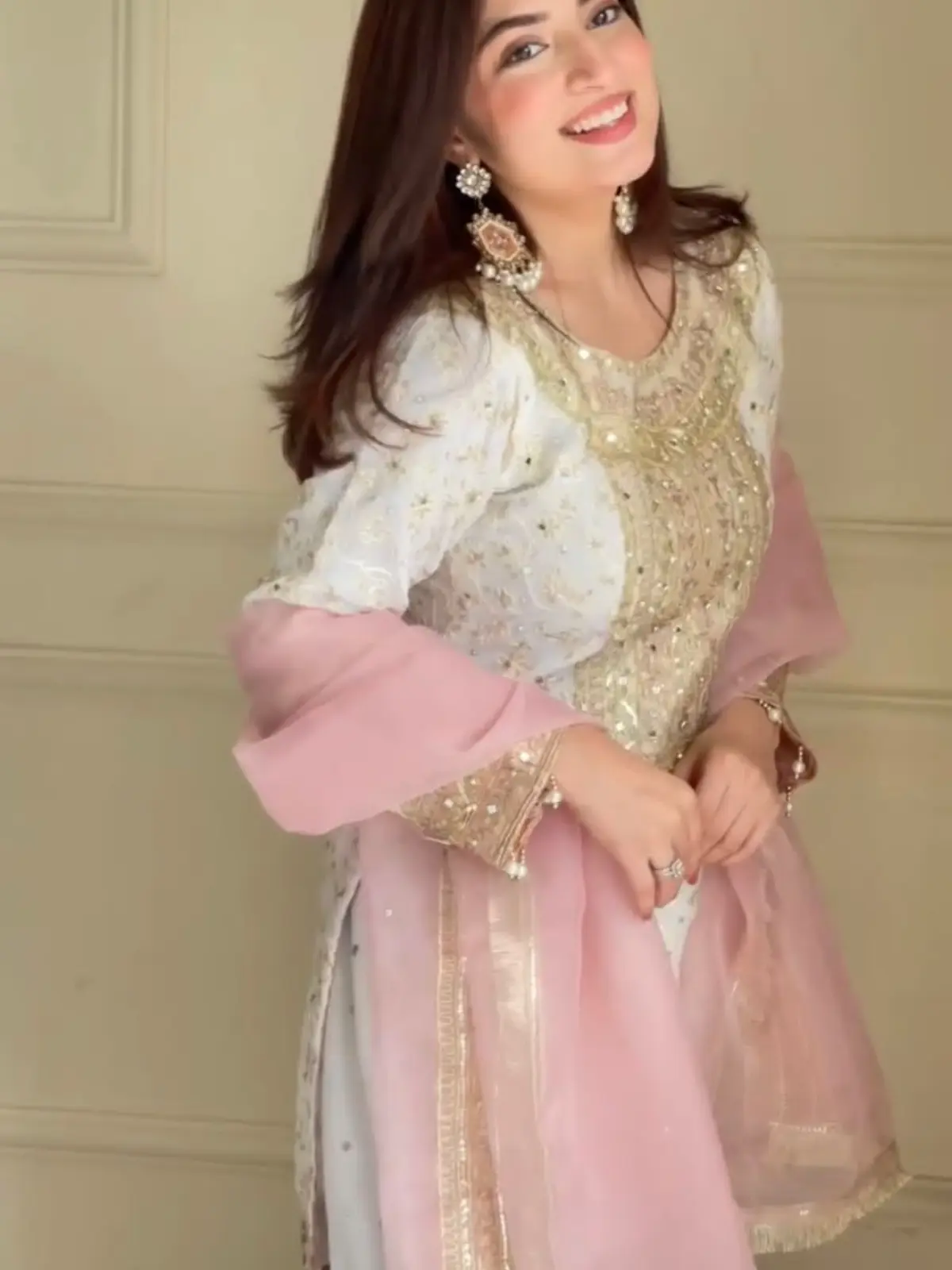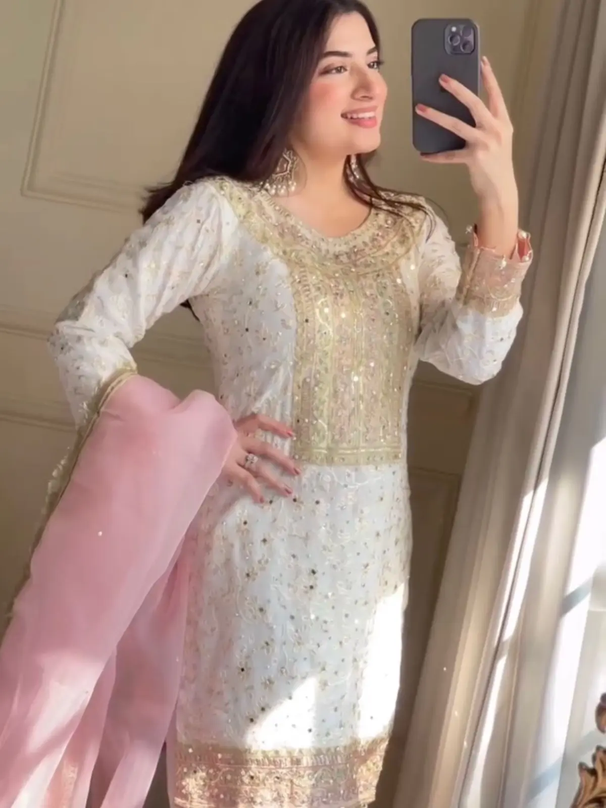 Exclusive Chinon Suit Set with Sequins Embroidery – Kurti, Plazzo & Organza Dupatta