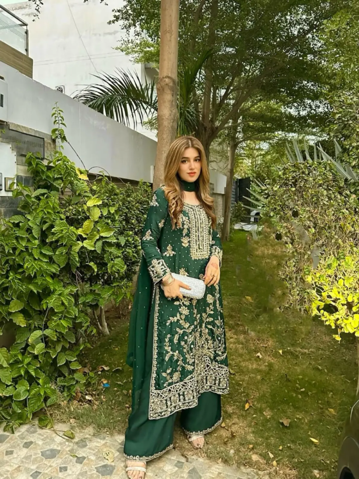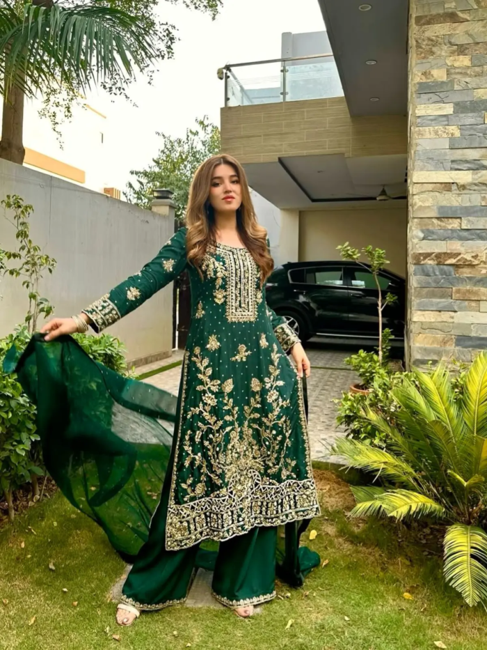 Exclusive Chinon Suit Set with Sequins Embroidery – Kurti, Plazzo & Organza Dupatta
