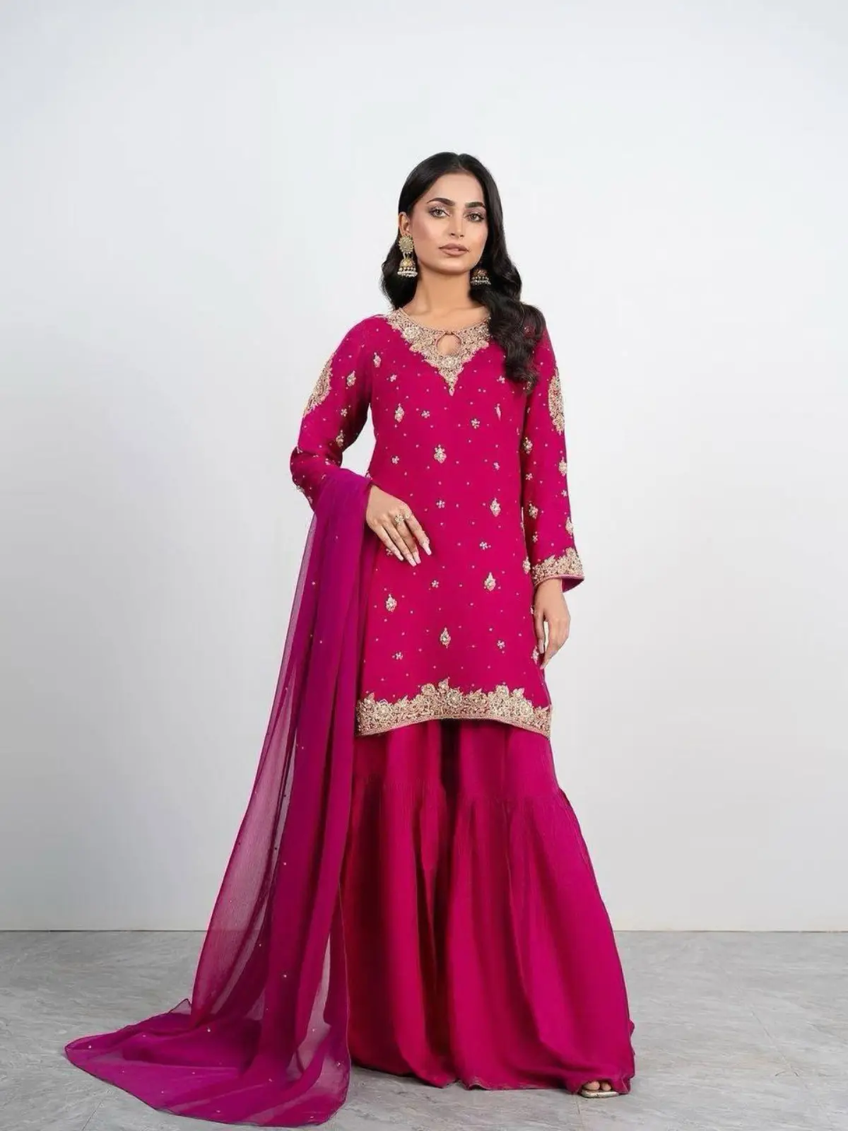 Includes: Fully Stitched Kurti (Top), Sharara, and Dupatta