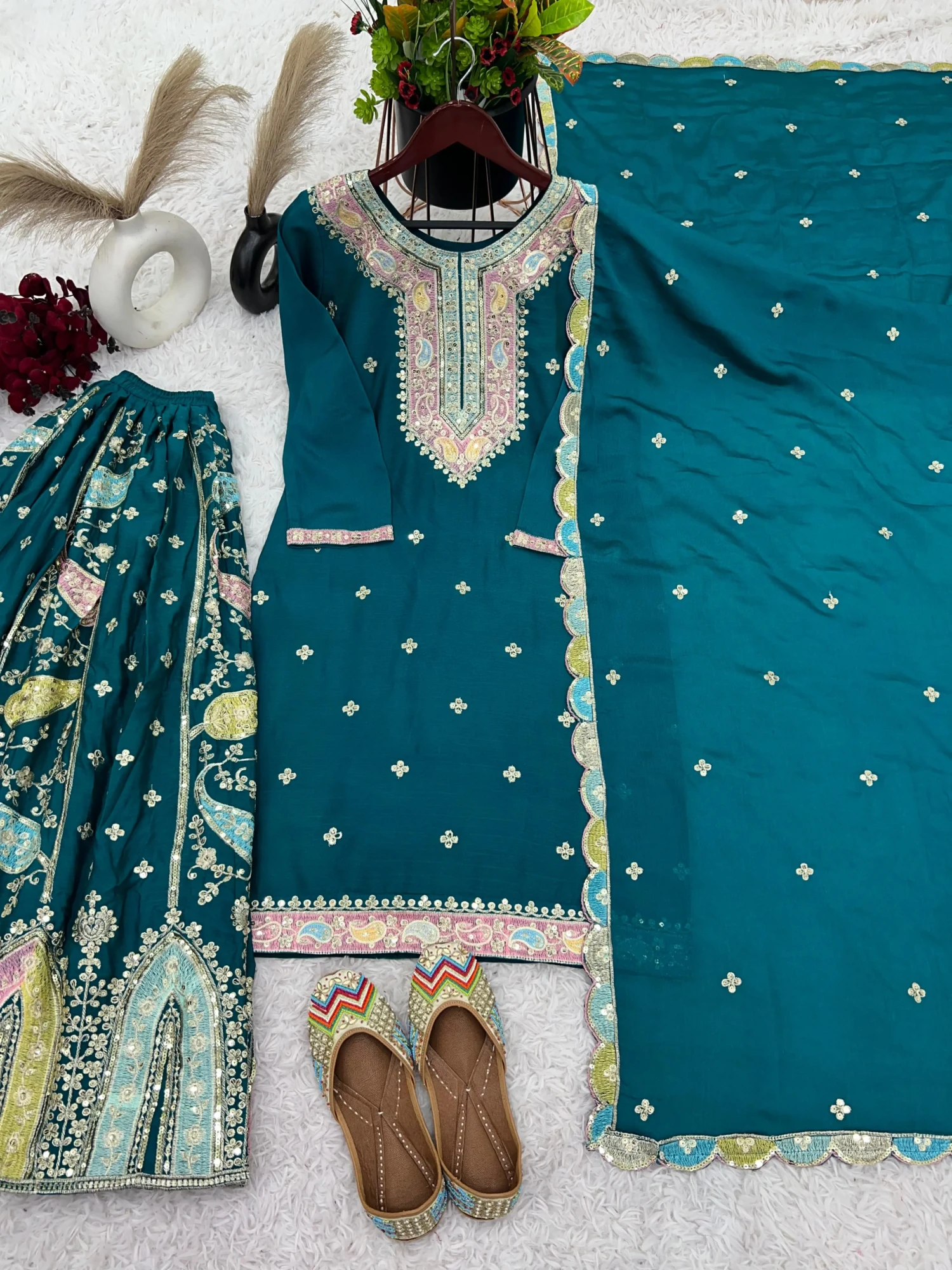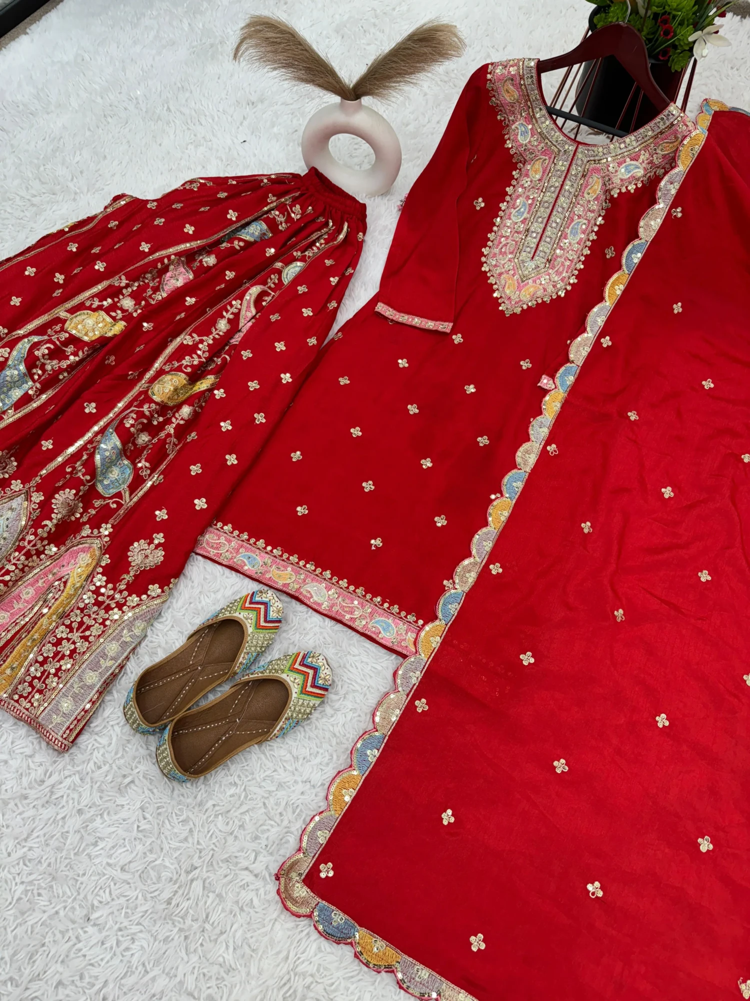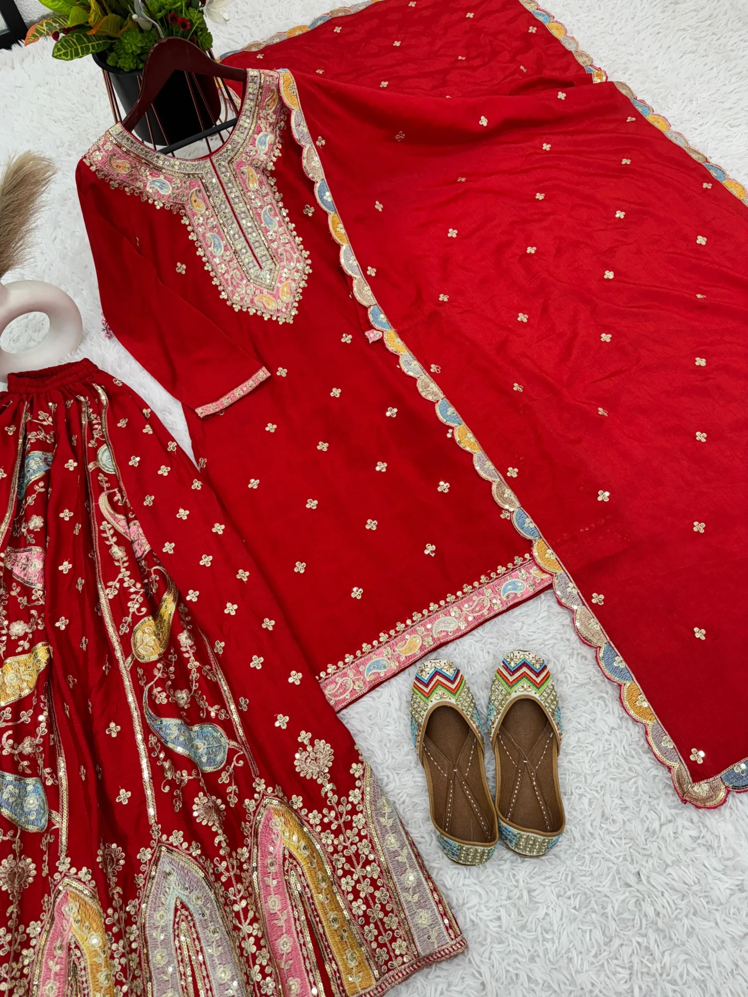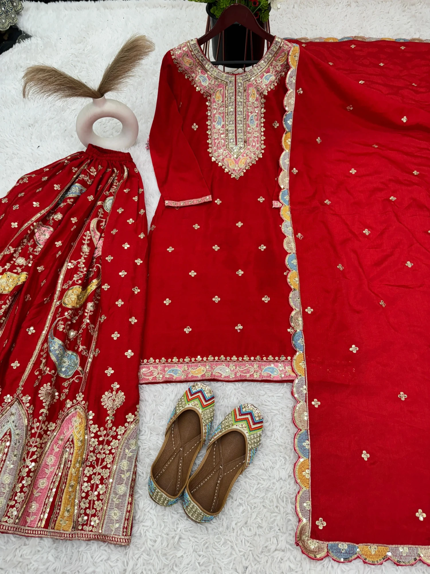 Experience elegance and premium craftsmanship with the ZF-377 Designer Sharara Set. Crafted from heavy pure Chinon silk, this fully-stitched, ready-to-wear ensemble features intricate multi-thread embroidery with shimmering sequins, offering a regal look perfect for weddings, festive celebrations, and special occasions.