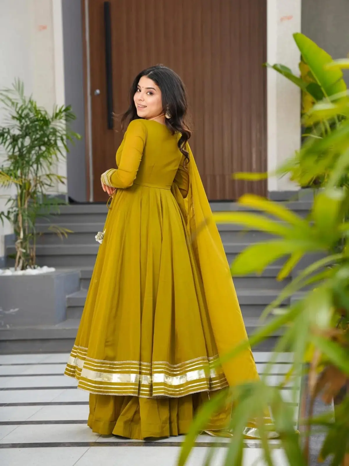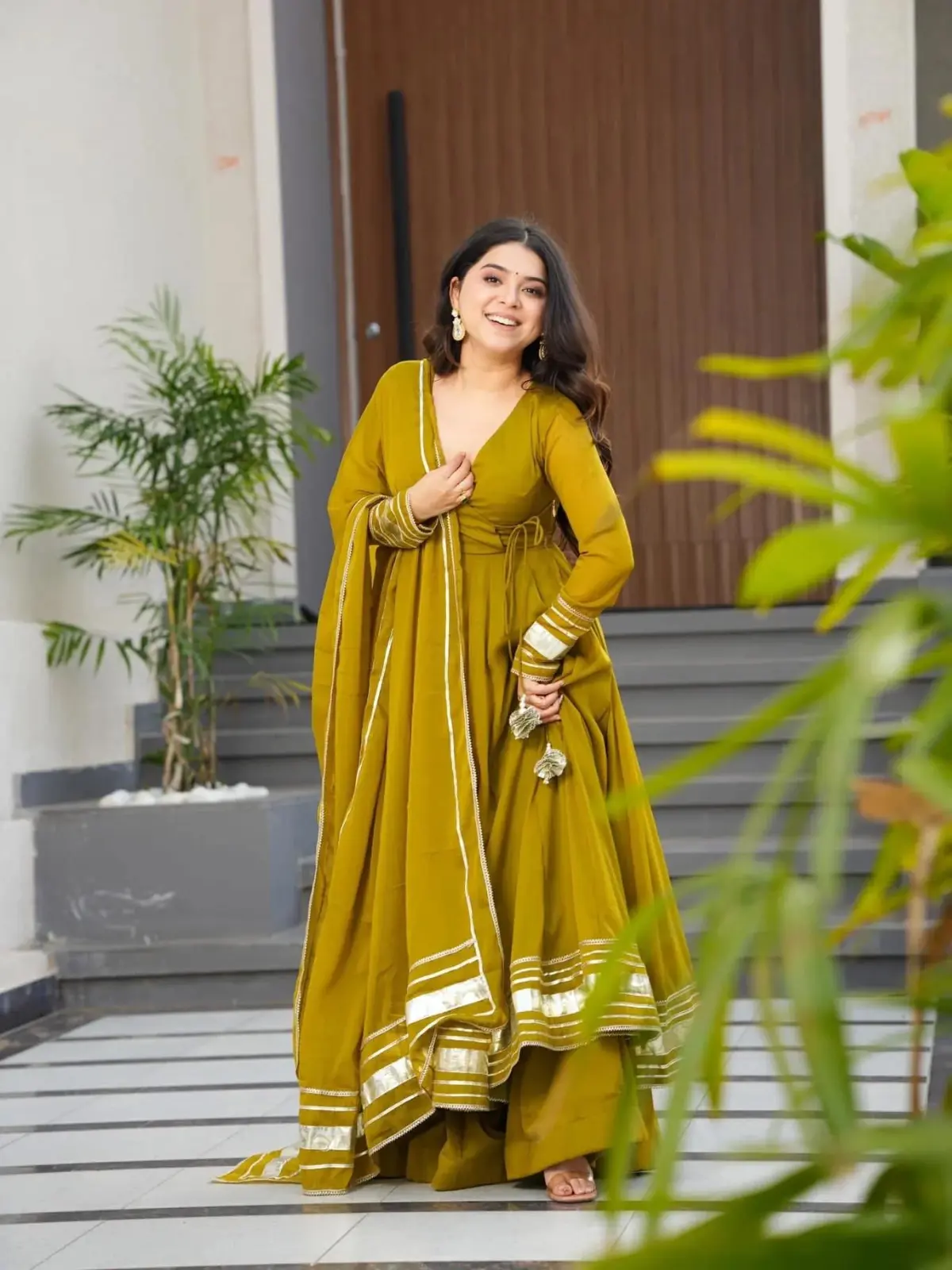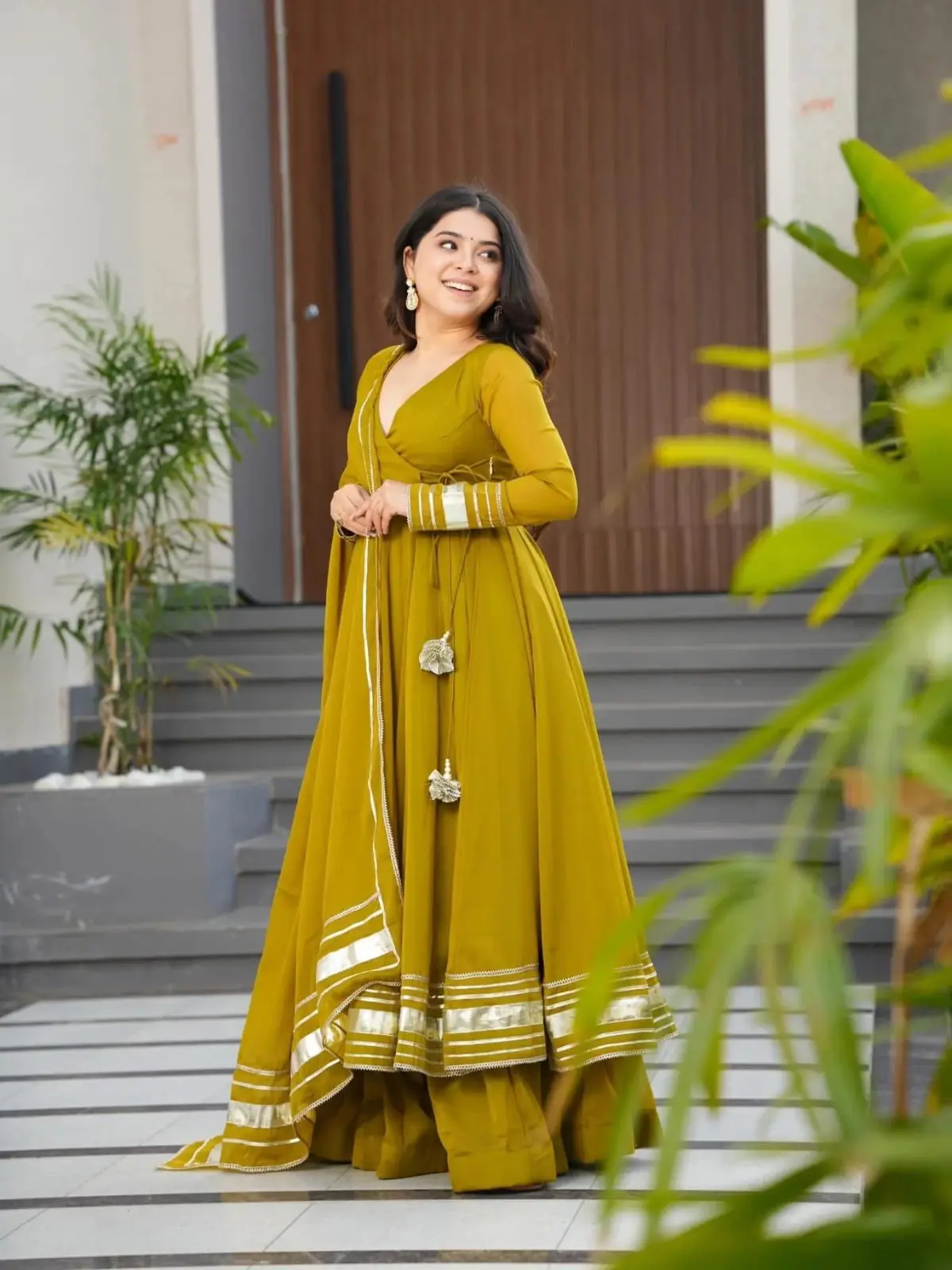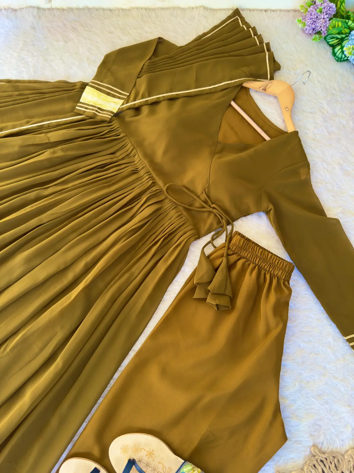 Elegant Mustard Angrakha-Style Gown Set in Pure Fox Georgette