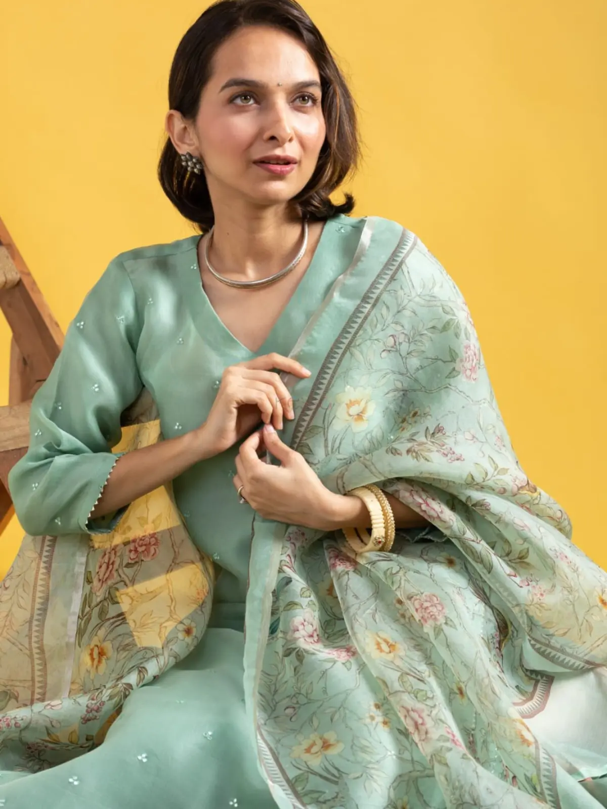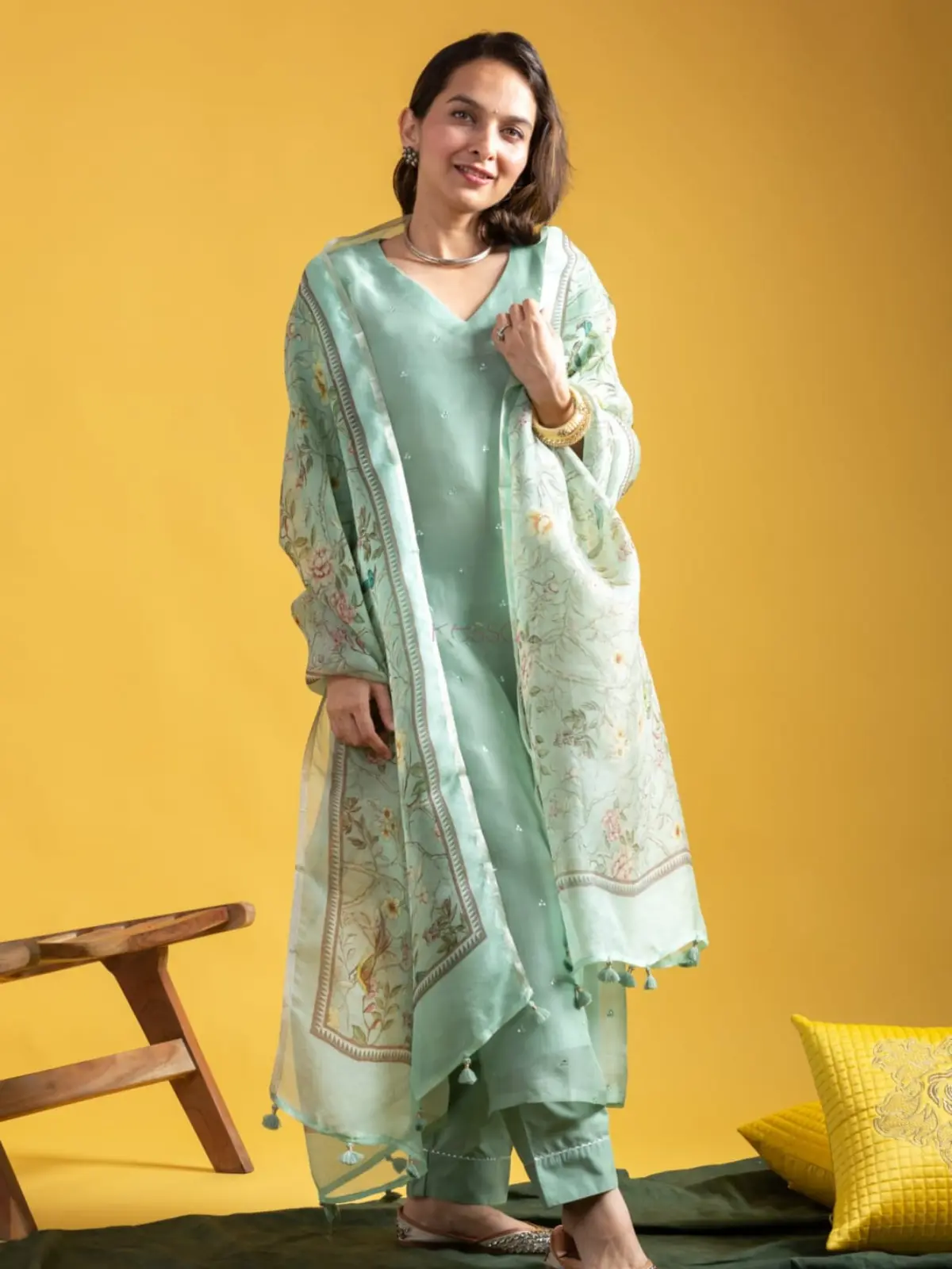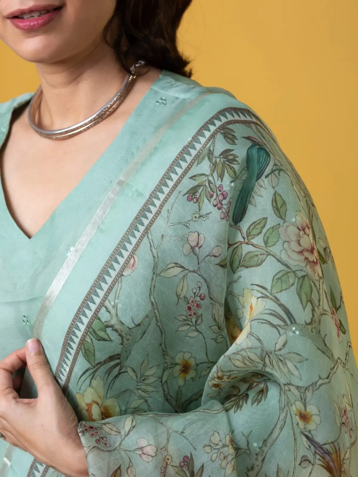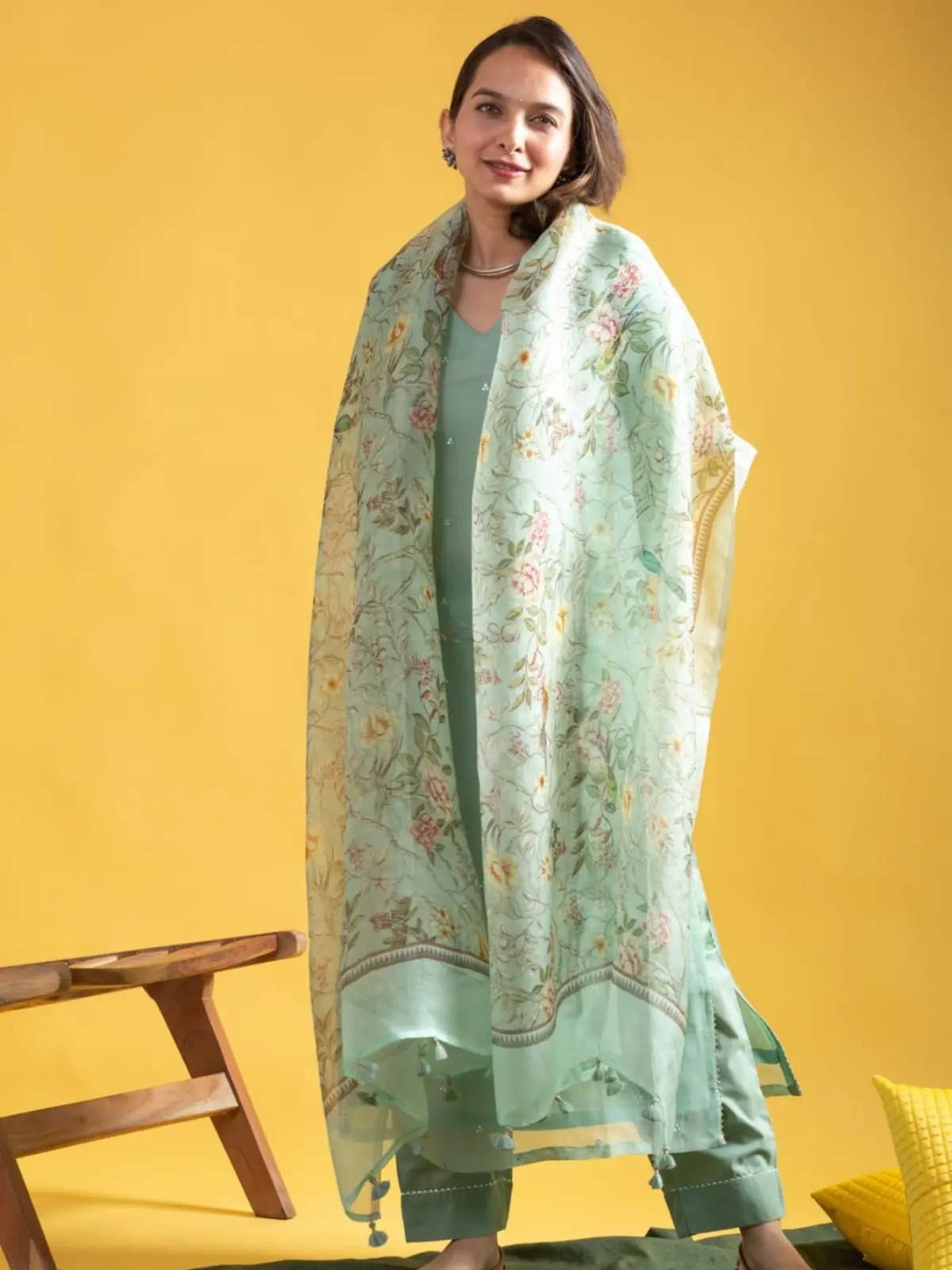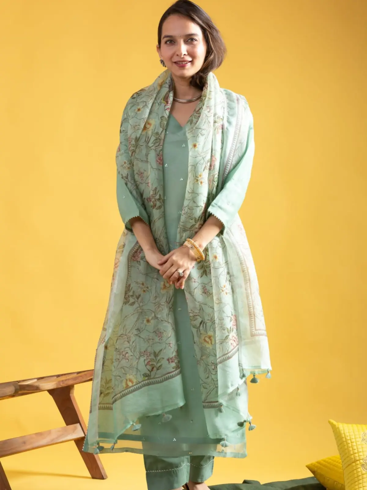 Vibrant Green & Blue Chinon Three-Piece Set with Printed Kurti, Flared Pants & Dupatta – Exclusive Collection