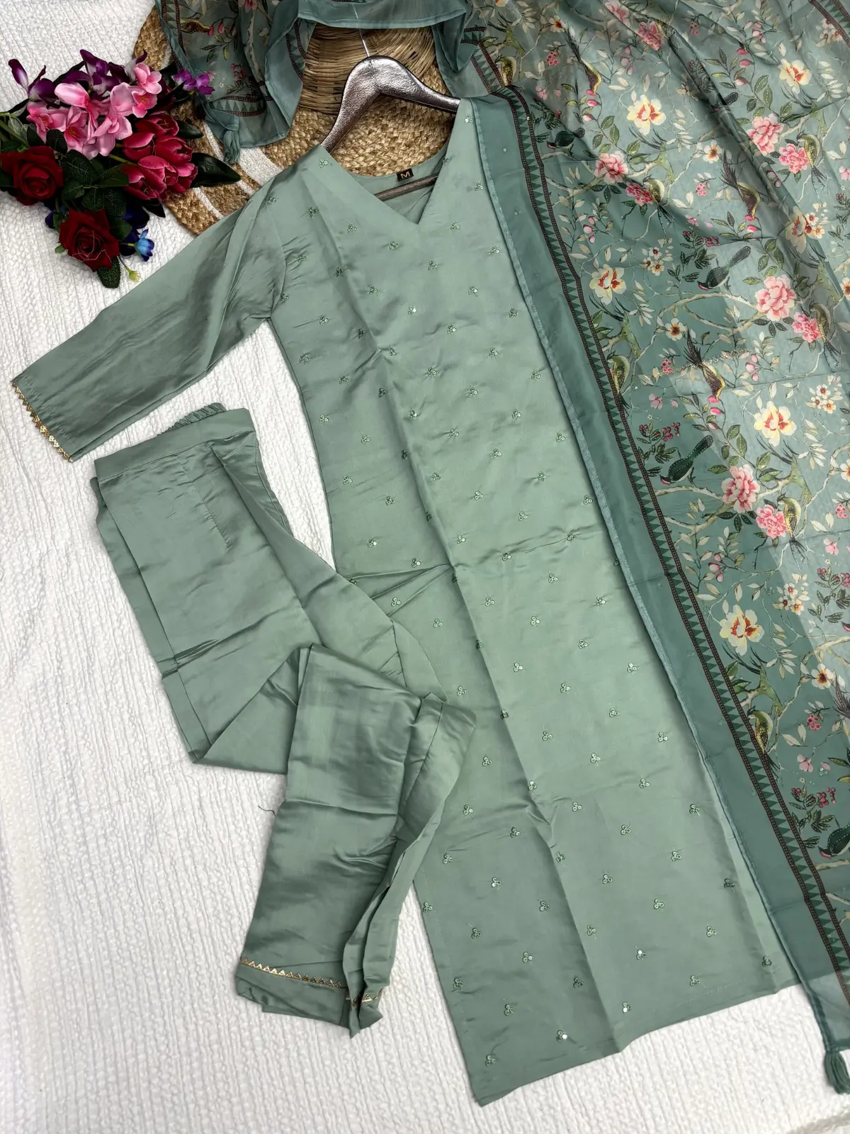 Exclusive Chinon Suit Set with Sequins Embroidery – Kurti, Plazzo & Organza Dupatta