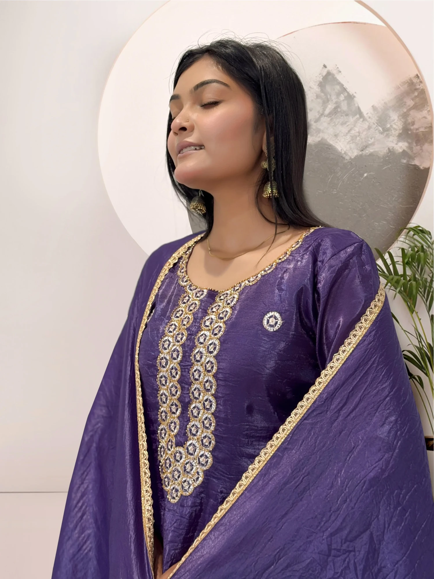 Step into refined elegance with this exclusive designer Chinon suit set, featuring a beautifully embroidered kurti, matching plazzo, and a delicate organza dupatta. Crafted for comfort and style, this fully stitched ensemble is perfect for festive occasions, parties, and cultural celebrations.