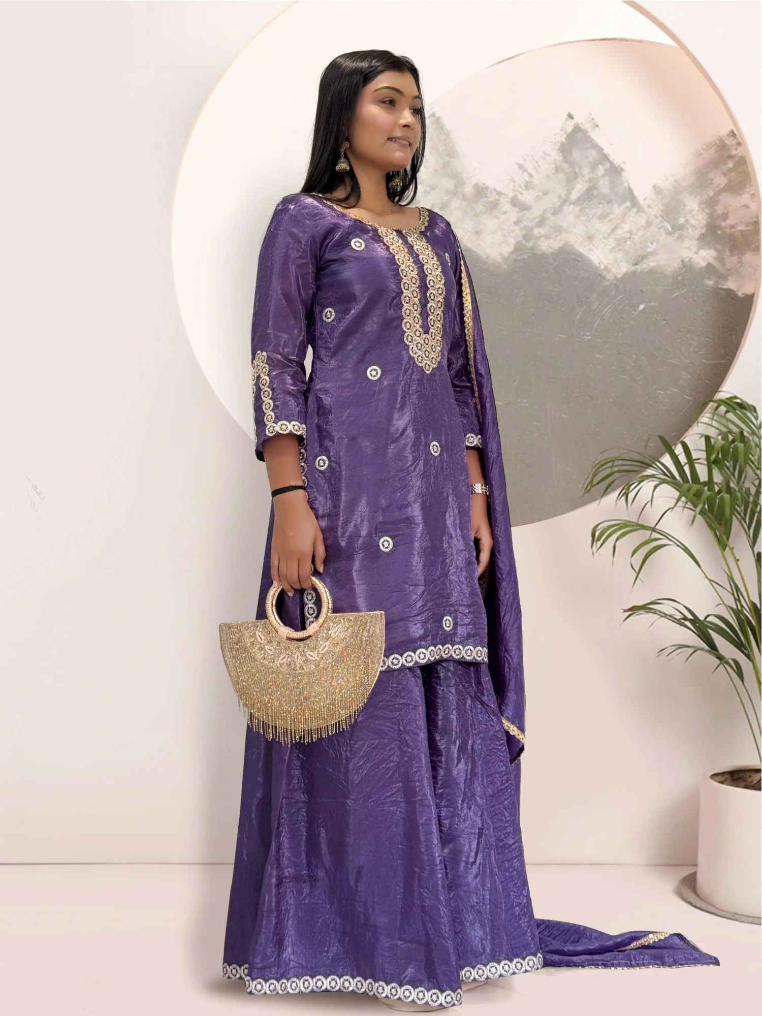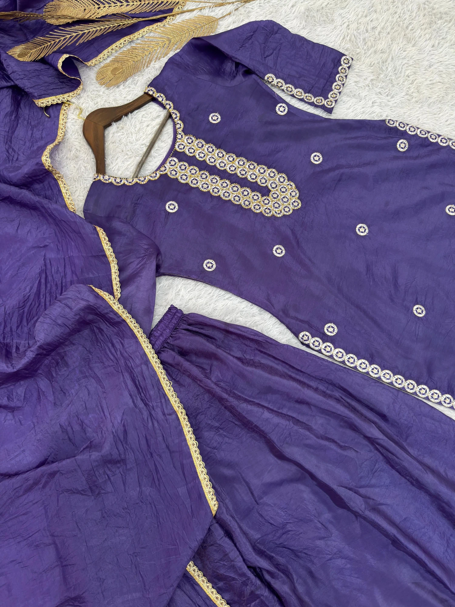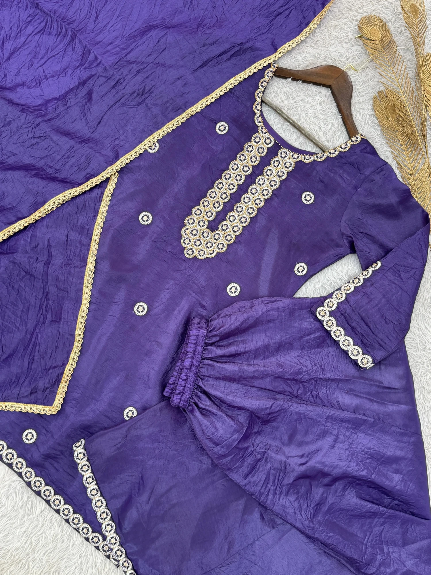 Exclusive Chinon Suit Set with Sequins Embroidery – Kurti, Plazzo & Organza Dupatta