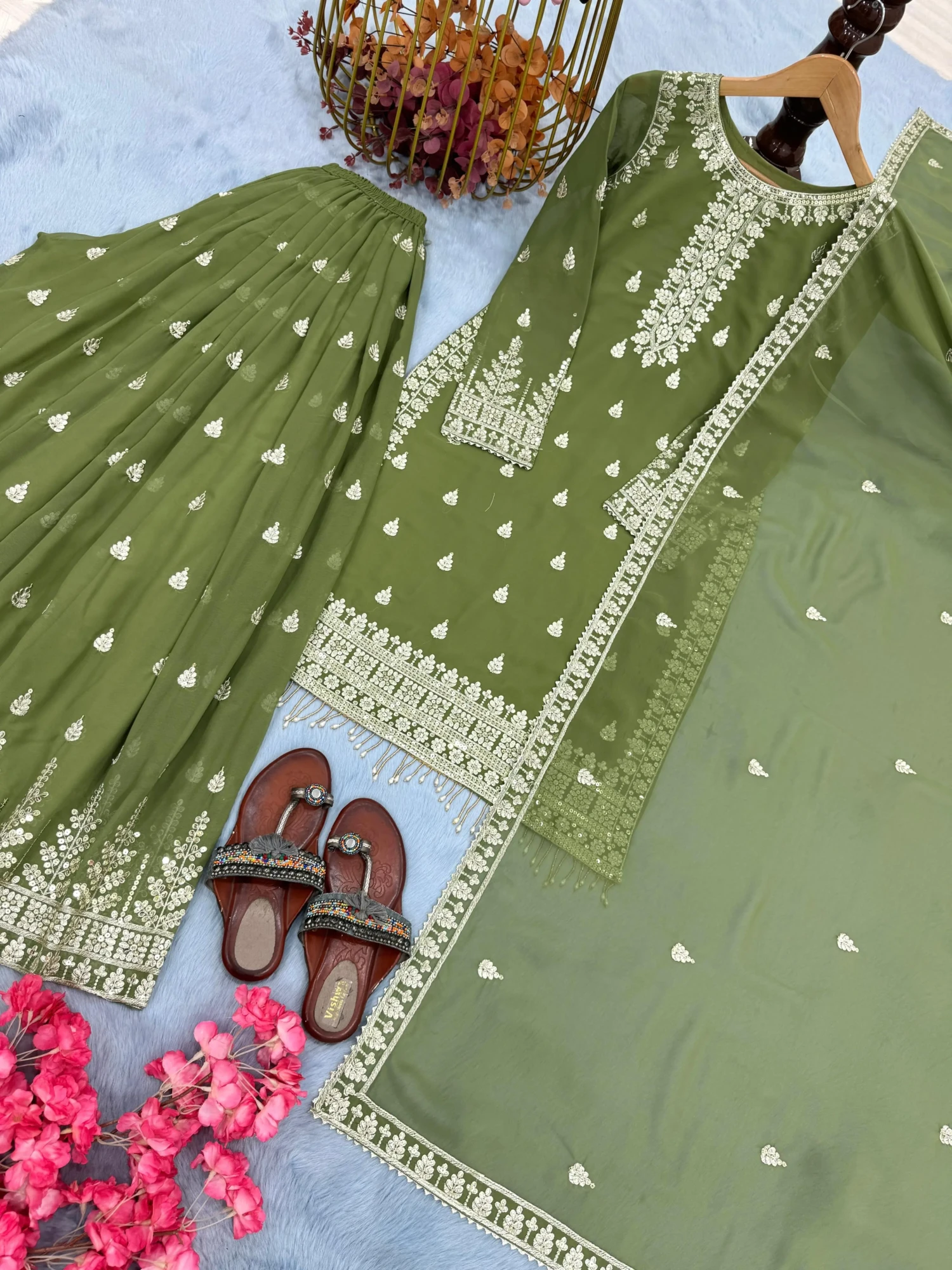 Elevate your ethnic wardrobe with this premium designer Top–Plazzo–Dupatta set, crafted from heavy faux georgette and adorned with intricate 5 mm sequence embroidery. Featuring a fancy latkan border and elegant design, this ready-to-wear ensemble combines festive charm with modern sophistication. Perfect for weddings, parties, and special occasions, the set ensures both comfort and a graceful look.