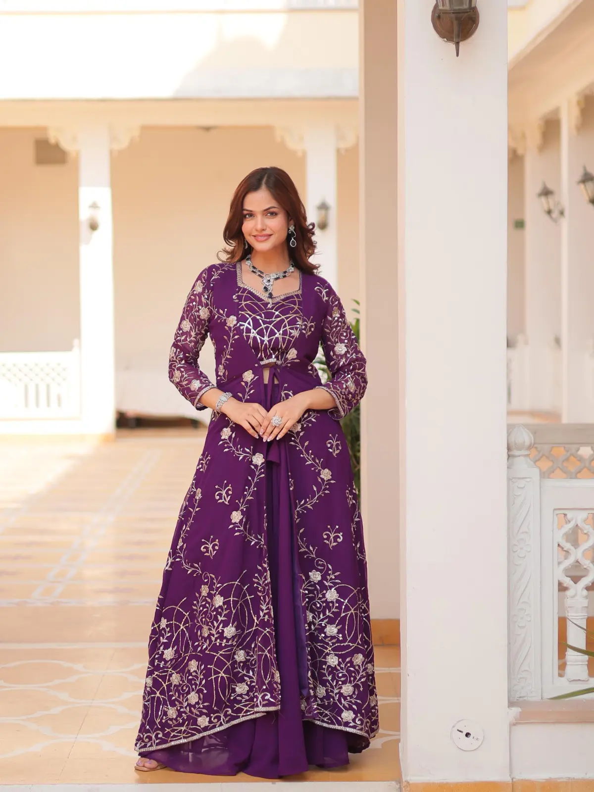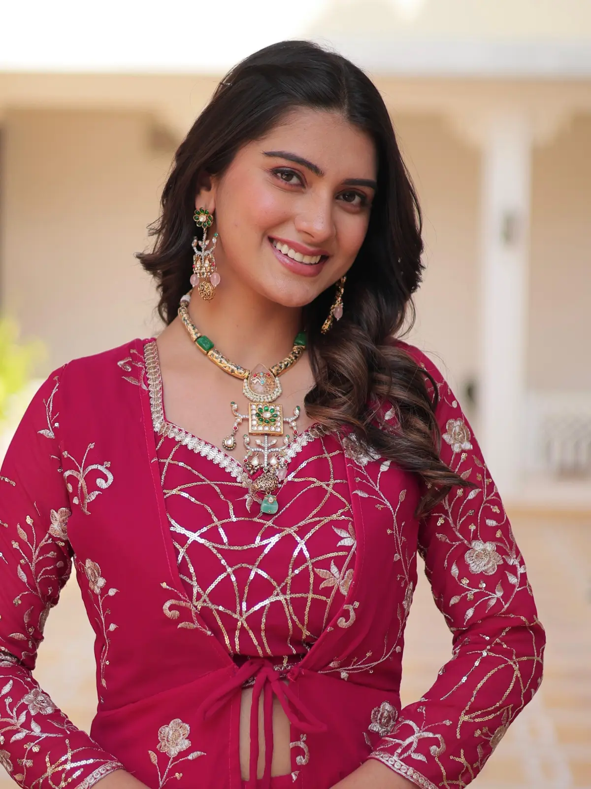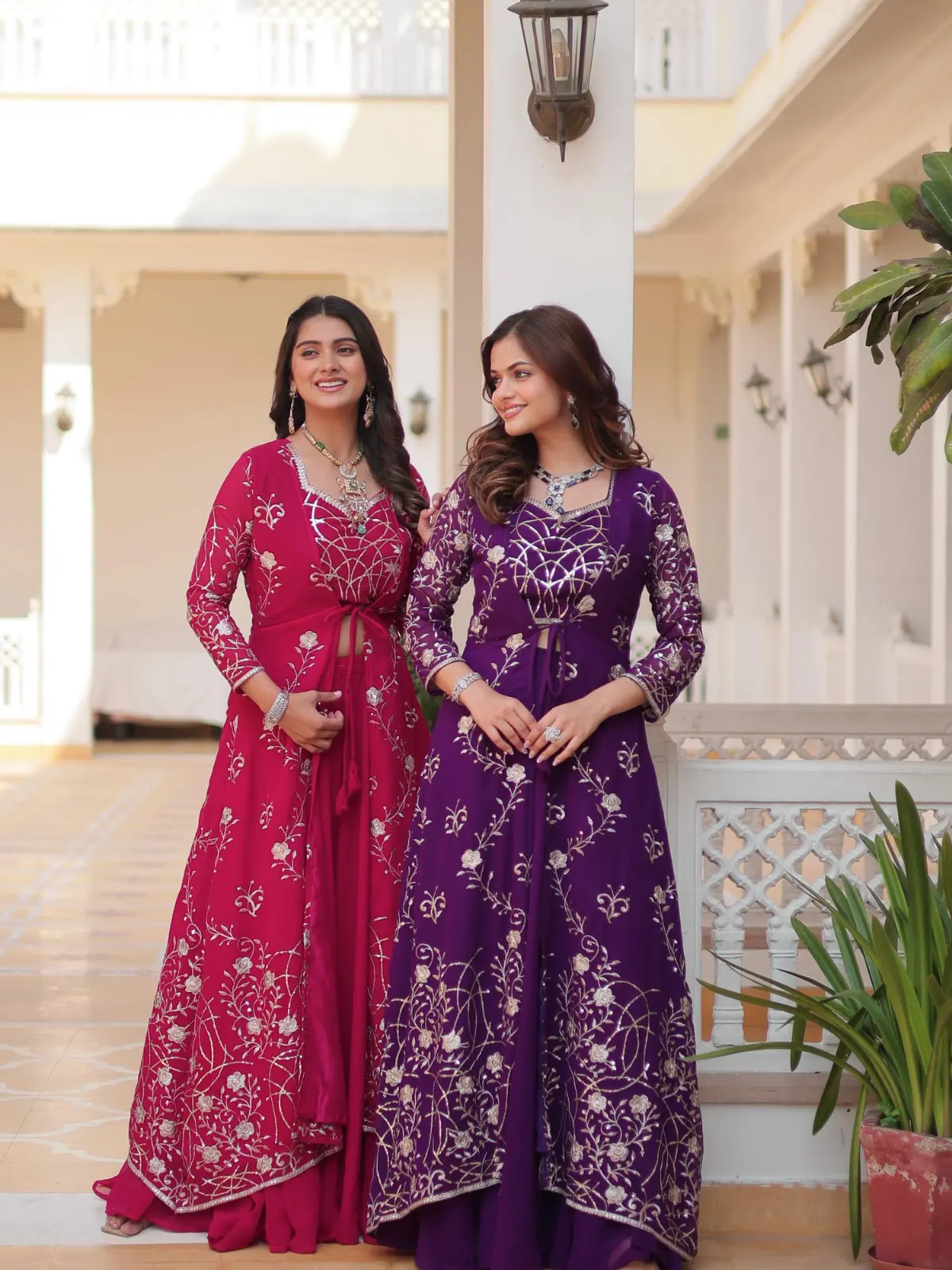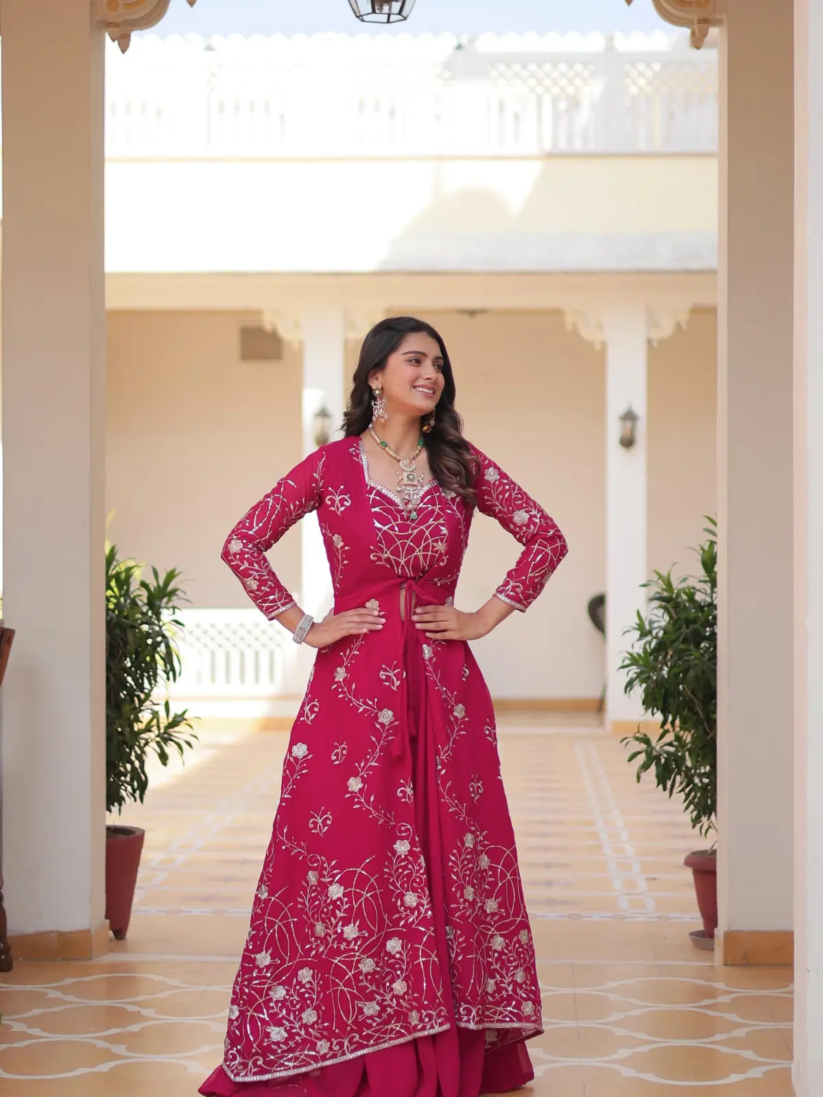 Celebrate the festive season in style with our newly launched 3-piece ensemble featuring a stunning Shrug, Embroidered Choli, and Palazzo set. Designed with elegance and comfort in mind, this outfit brings together the grace of traditional embroidery and the trendiness of a shrug silhouette.