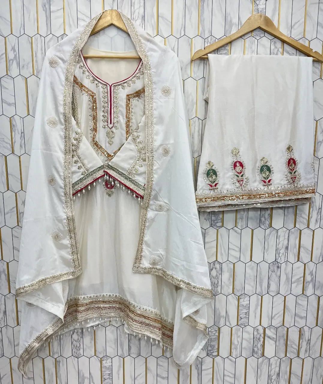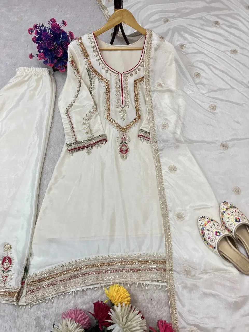 Presenting a festive ethnic designer outfit featuring pure chinon silk fabric with elegant sequence embroidery. This three-piece set includes a top, plazzo, and dupatta, all fully stitched and ready to wear. Designed for style and comfort, this outfit is perfect for weddings, receptions, parties, and festive celebrations.