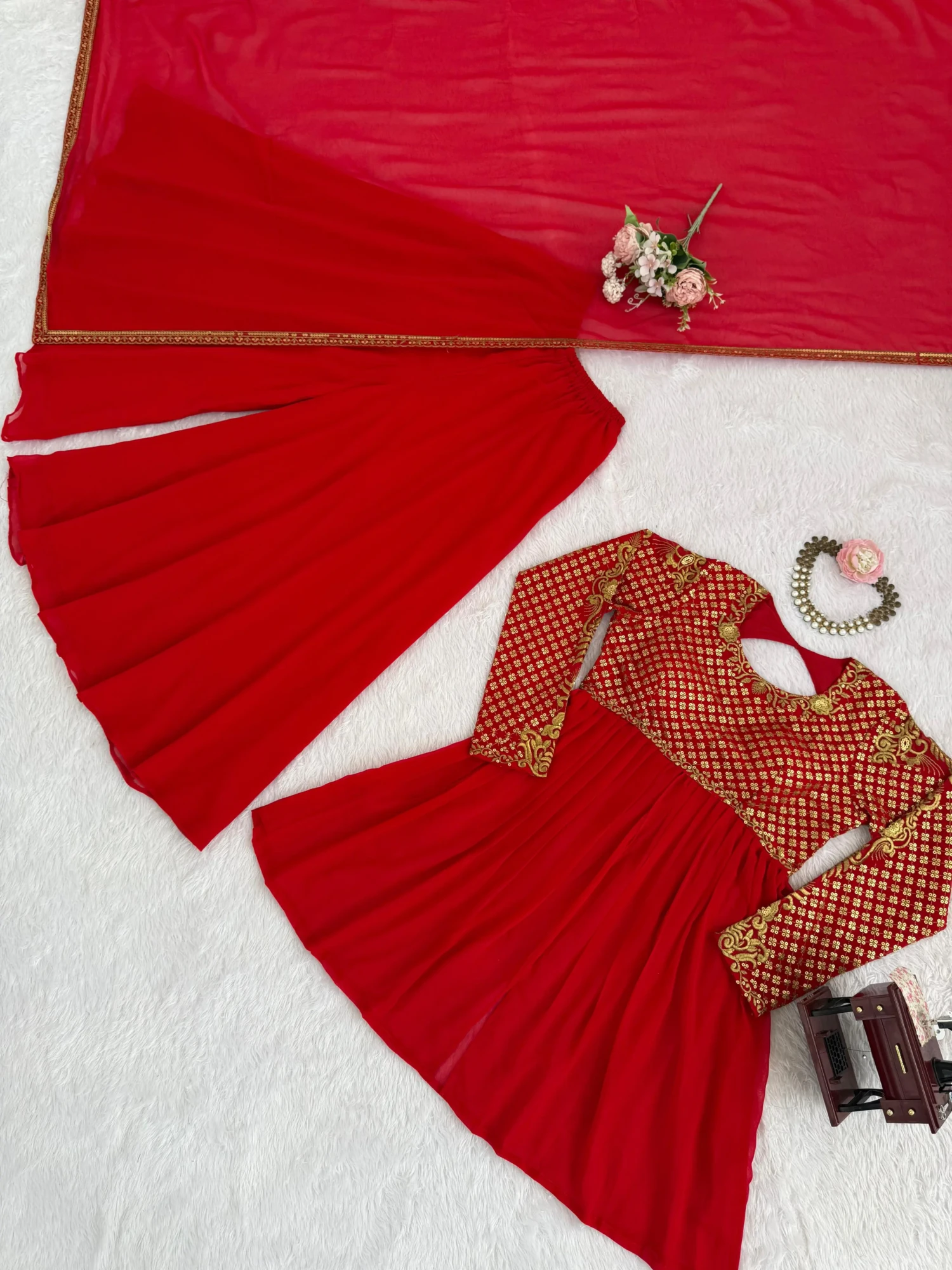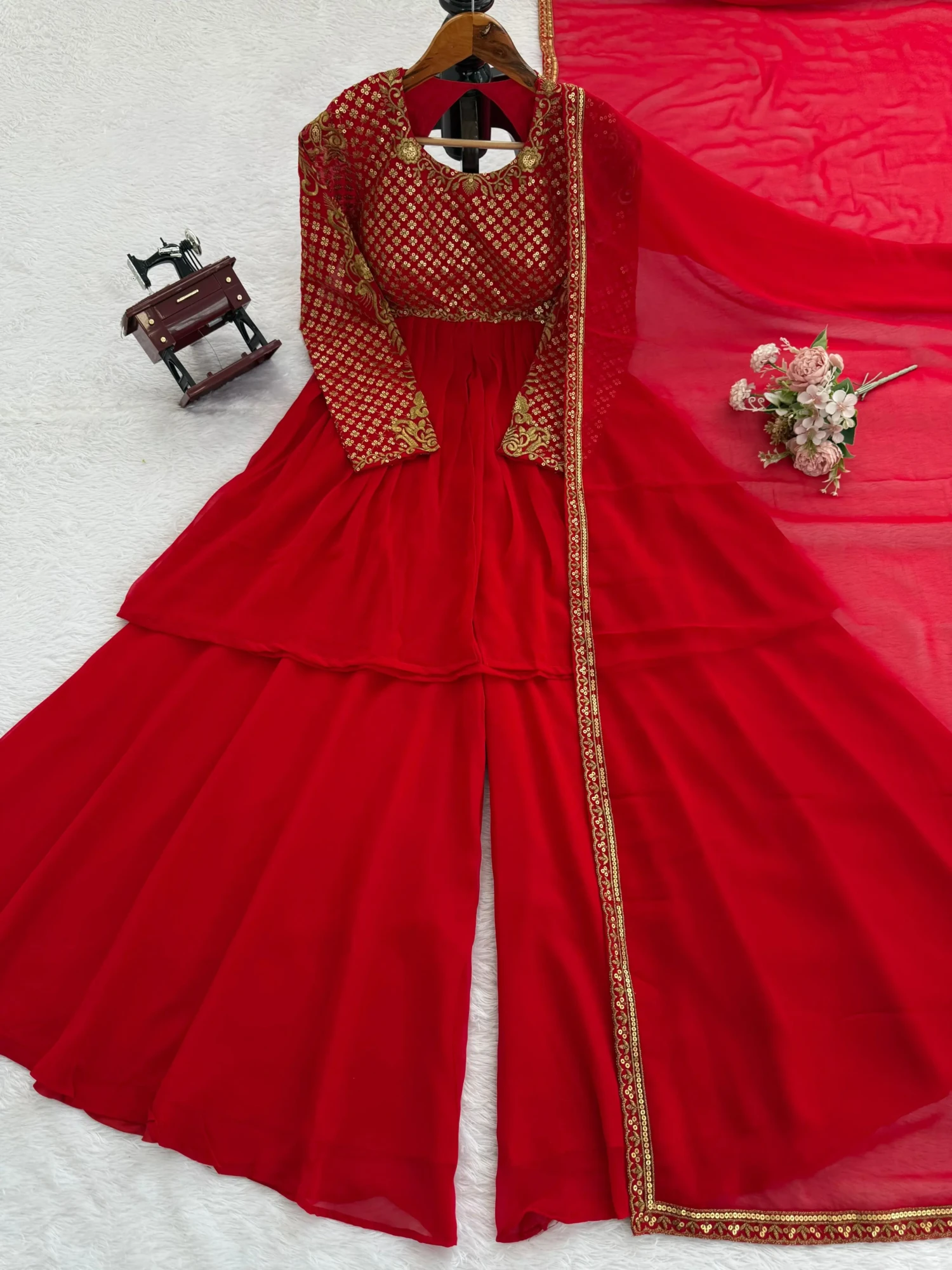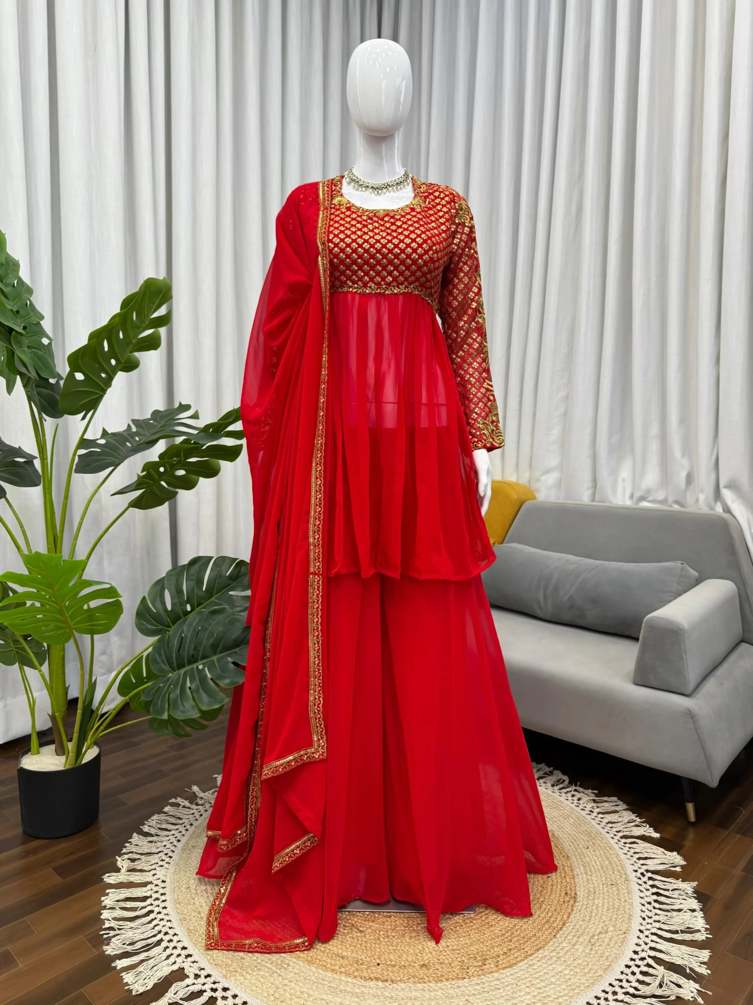 Enhance your festive wardrobe with this elegant designer Sharara set crafted in premium faux georgette fabric. Featuring intricate embroidery with sequence detailing, the outfit includes a fully embroidered top, plain sharara for comfort, and a beautifully bordered dupatta. A perfect blend of traditional elegance and boutique quality, this ensemble is ideal for weddings, festive occasions, and celebrations.