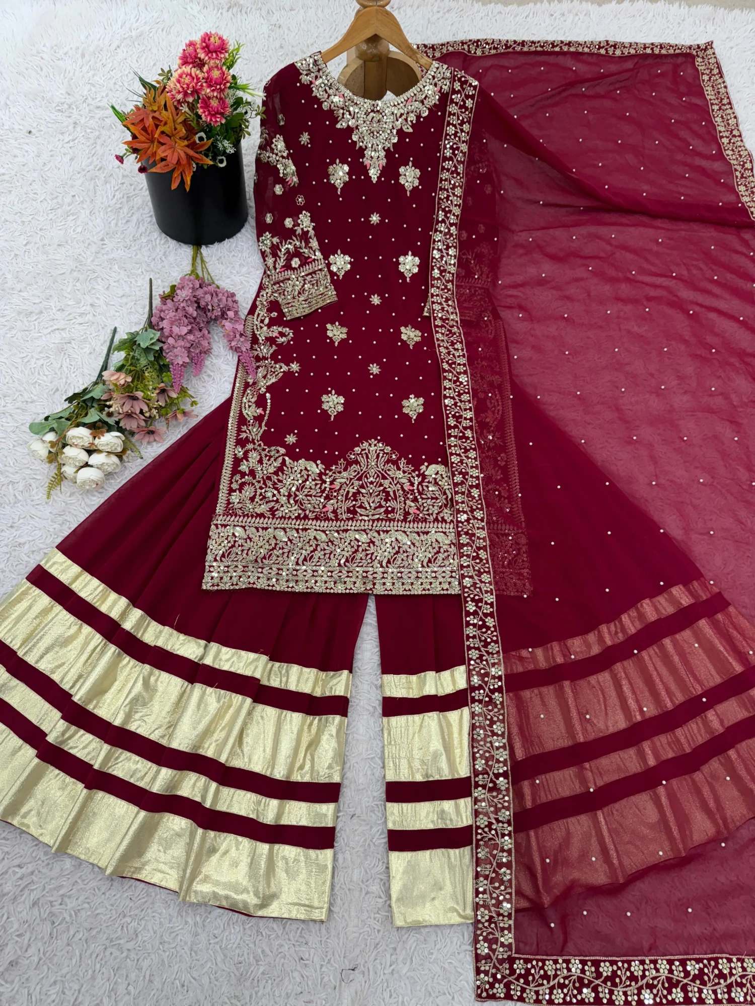 This embroidered georgette silk Sharara set offers a premium designer look while ensuring maximum comfort, making it a must-have addition to your festive and occasion wear wardrobe.