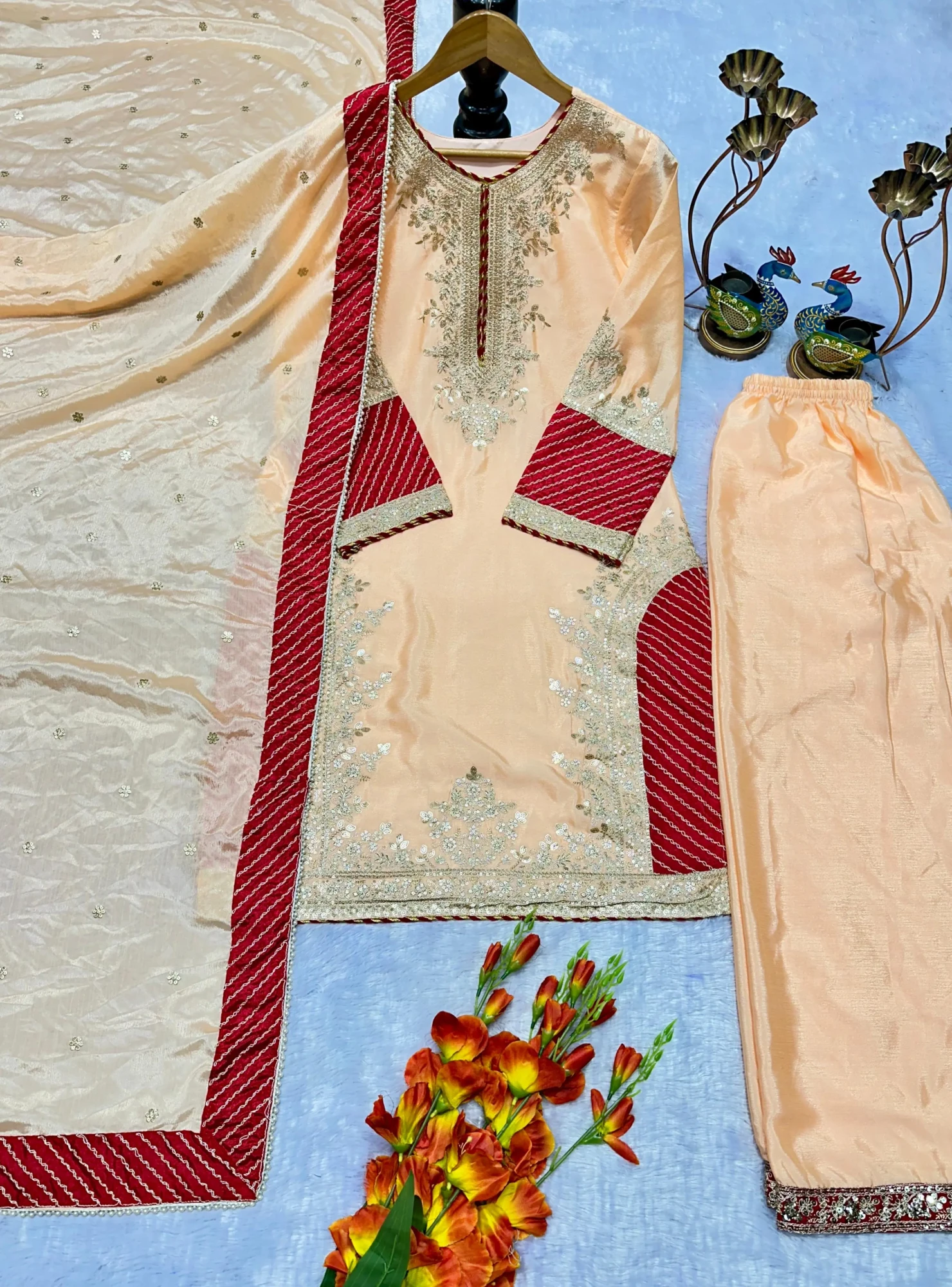 JD-619 – Heavy Gold Crush Silk 3-Piece Kurti, Plazzo & Dupatta Set with Embroidery and Bead Work