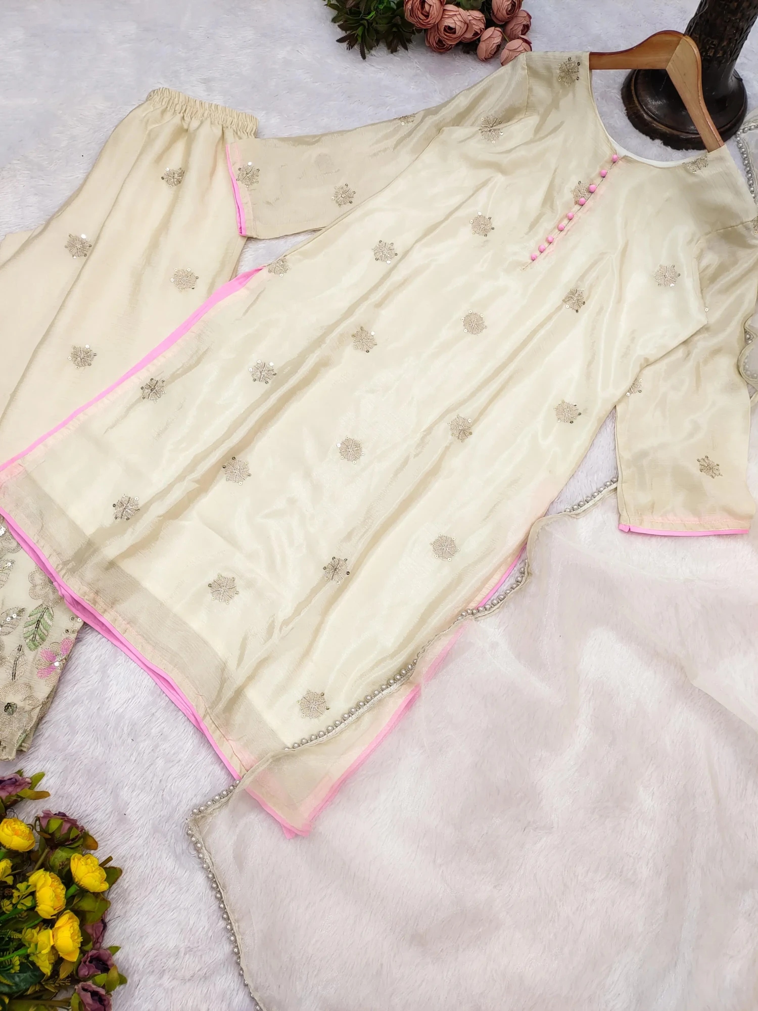Be the first to review “LG-1987 – Designer Roman Silk Suit with Sequence Embroidery, Plazzo, and Dupatta”