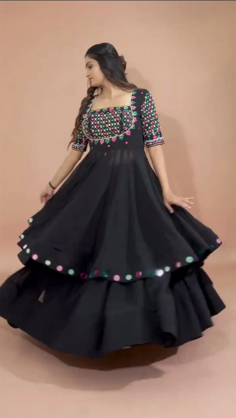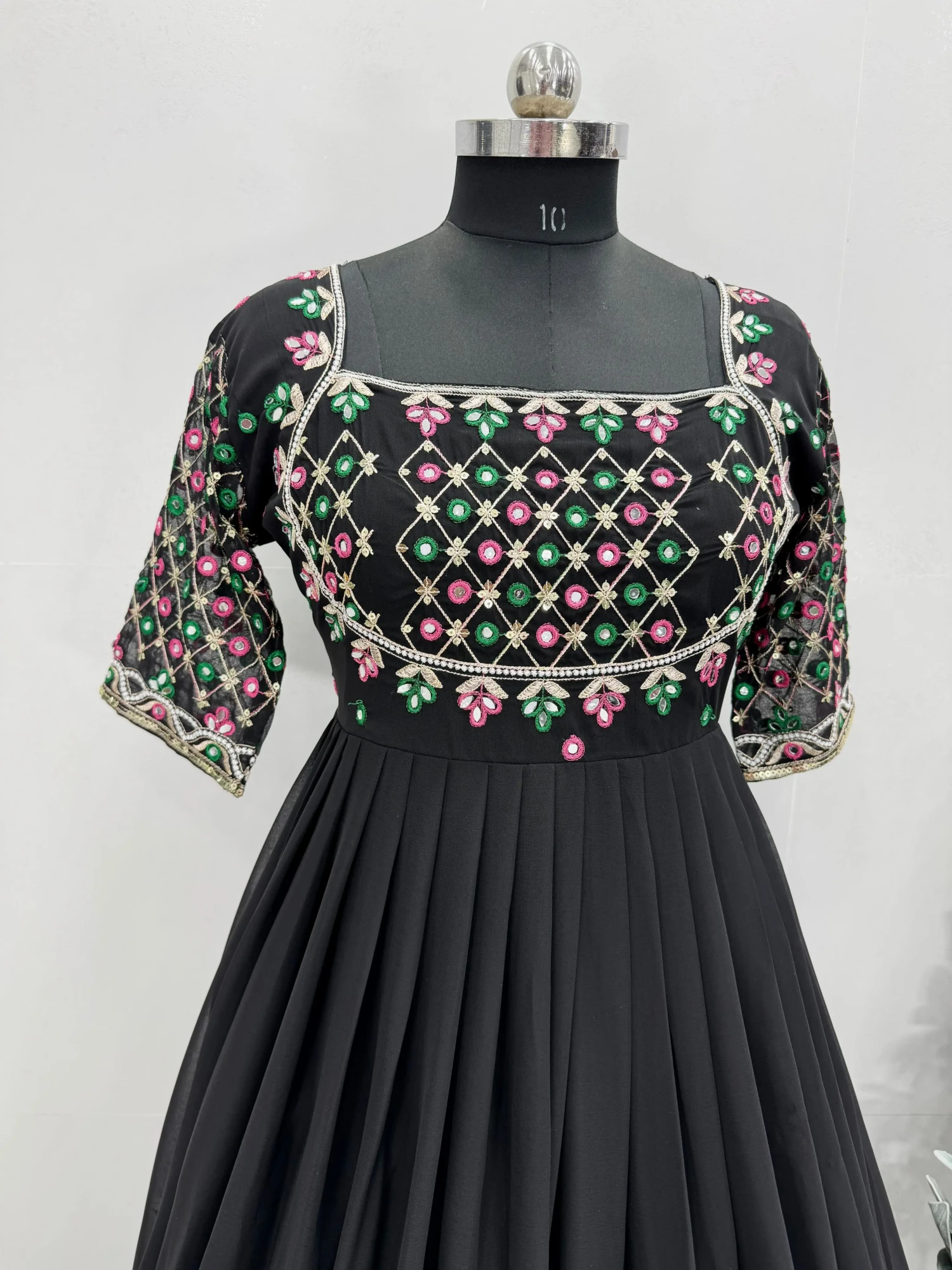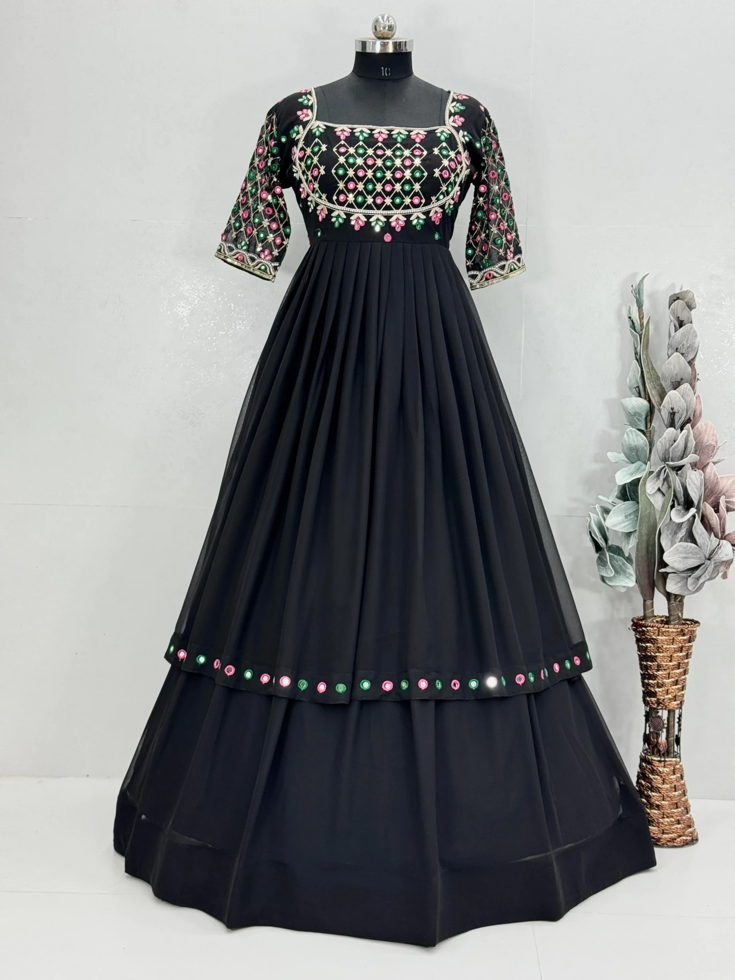 The sarara, also in faux georgette, features matching sequins embroidery with a comfortable 40-inch height for a flattering drape.