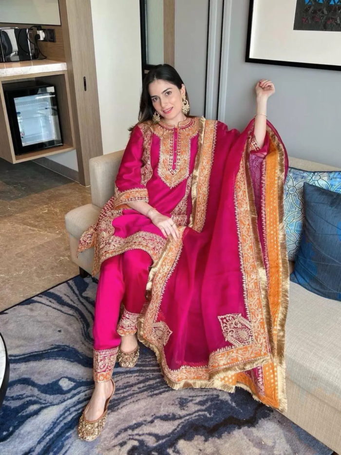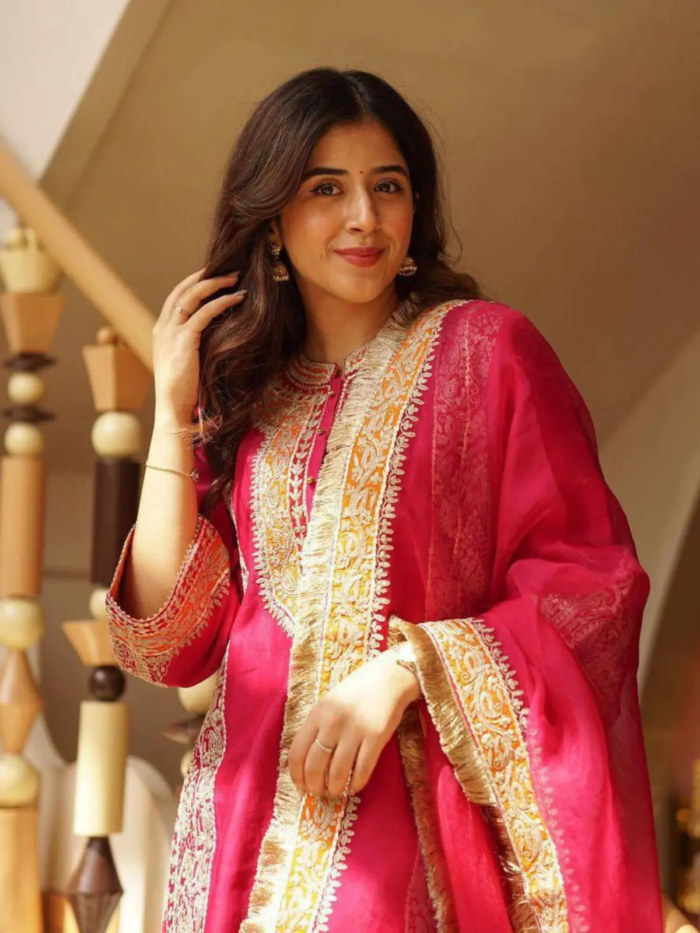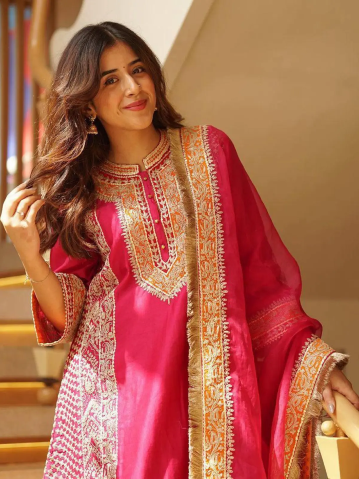 Add elegance to your ethnic wardrobe with this beautifully crafted Kurti-Plazzo Set, made from high-quality heavy Chinon Silk. Adorned with intricate Zari embroidery and paired with a stylish dupatta, this ensemble is perfect for festive occasions and celebrations.