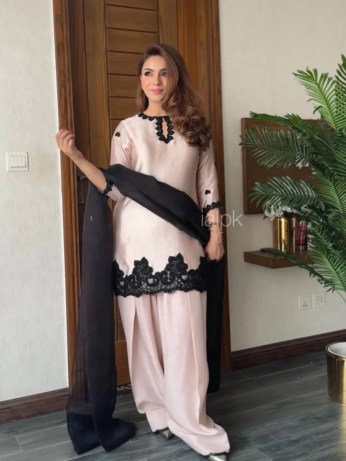 Designer Pure Natural Crepe Top & Farshi Palazzo Set with Embroidery and Organza Silk Dupatta – LADY LOOK-022