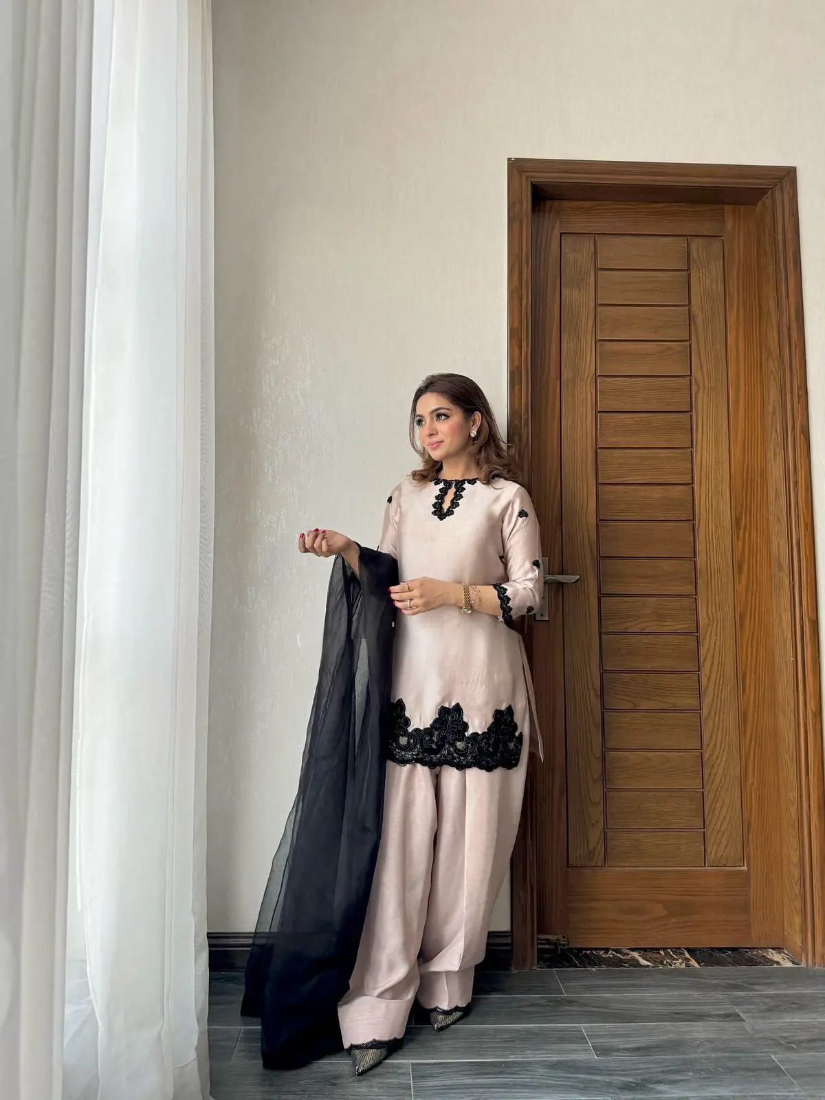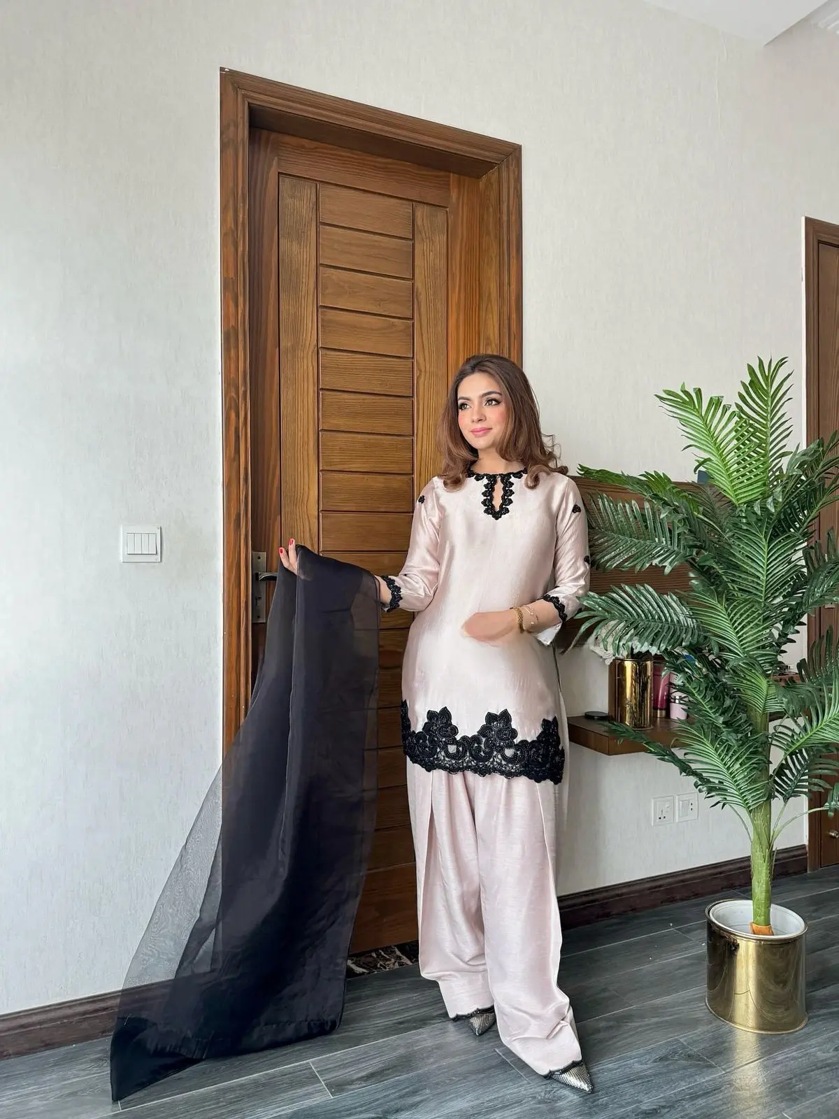 Pure Natural Crepe Satin Top, Farshi, and Dupatta Set