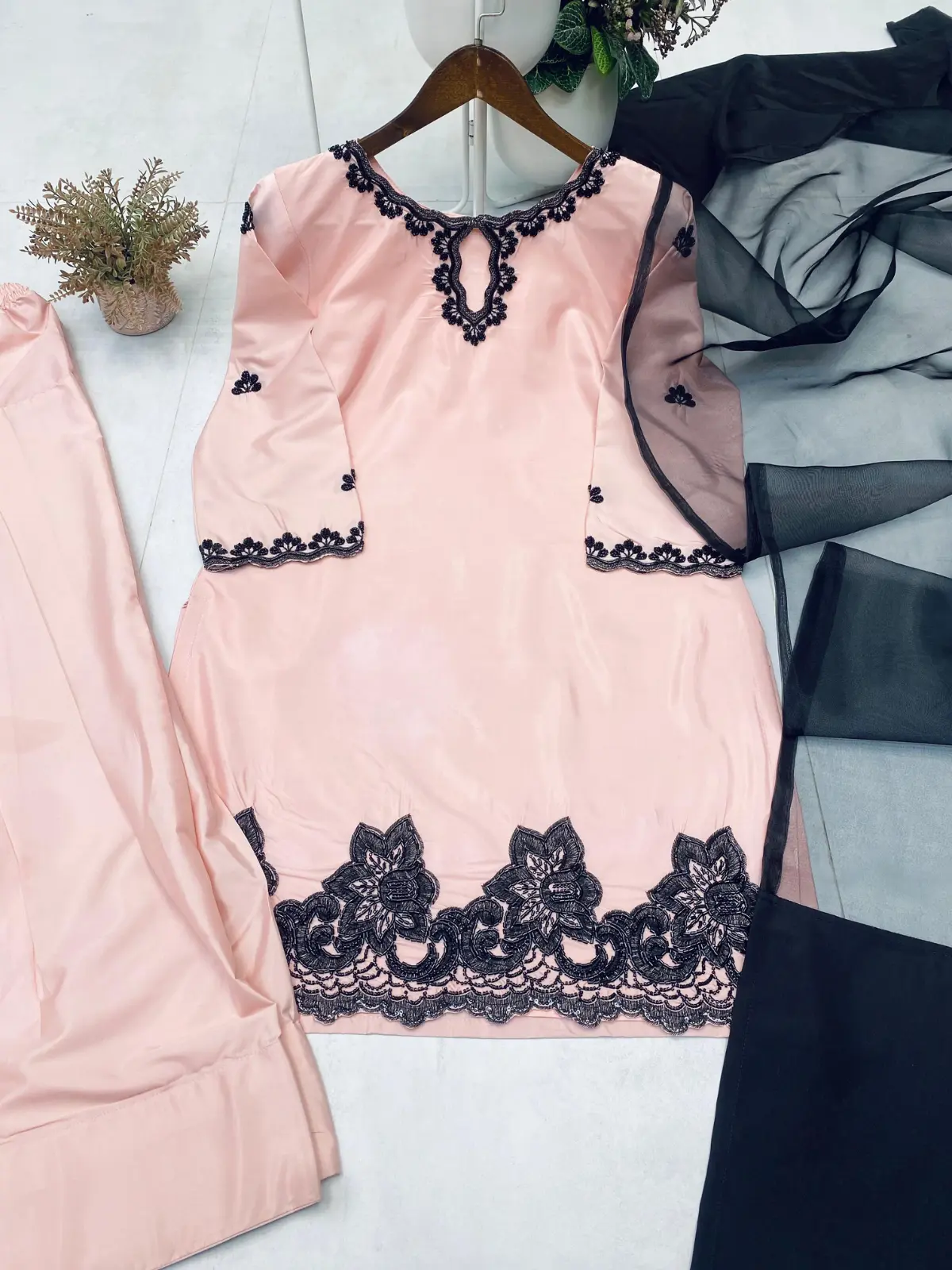 Exclusive Chinon Suit Set with Sequins Embroidery – Kurti, Plazzo & Organza Dupatta