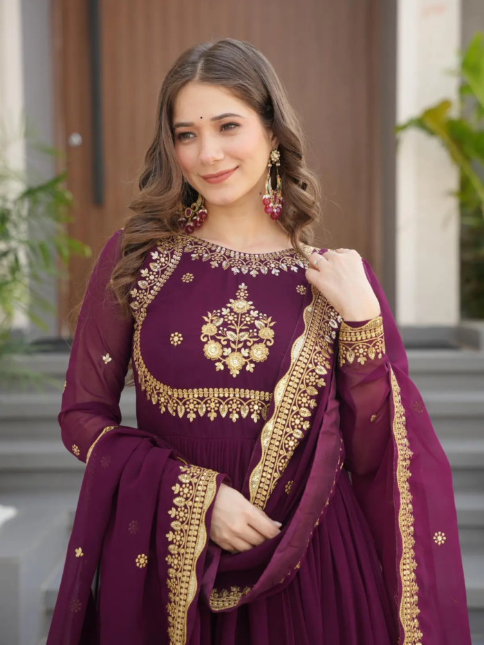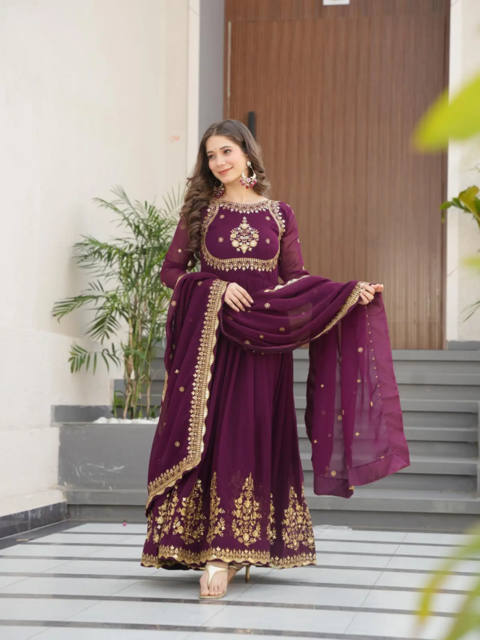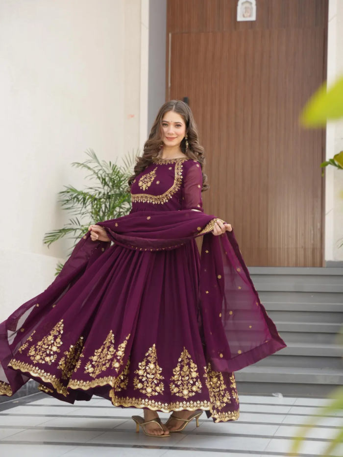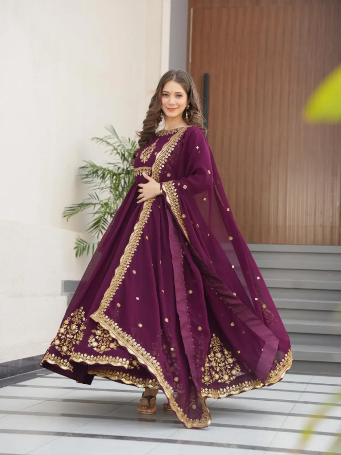 Step into timeless sophistication with our exclusive collection of designer gowns – where tradition meets contemporary elegance. Crafted with precision using luxurious Faux Blooming Georgette, each piece is delicately embellished with intricate Zari thread and sequin embroidery – created for women who deserve nothing but the best.