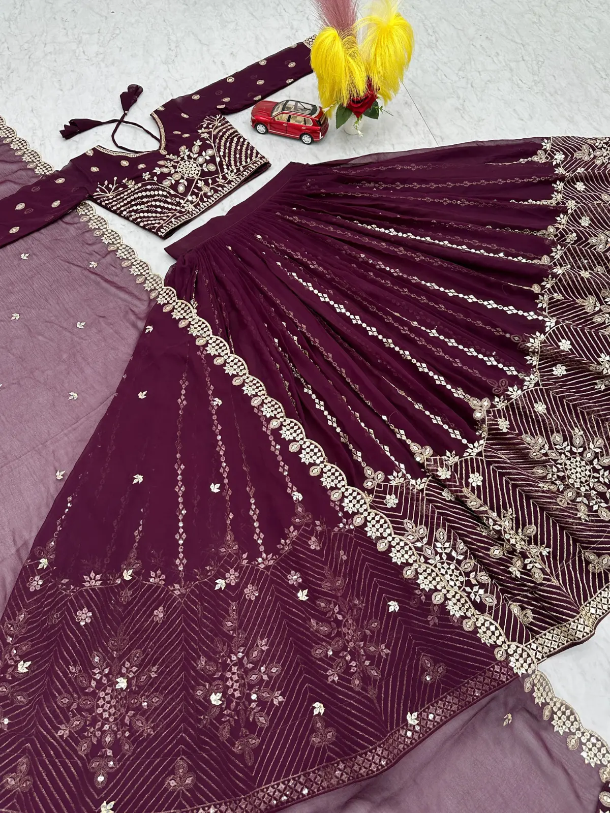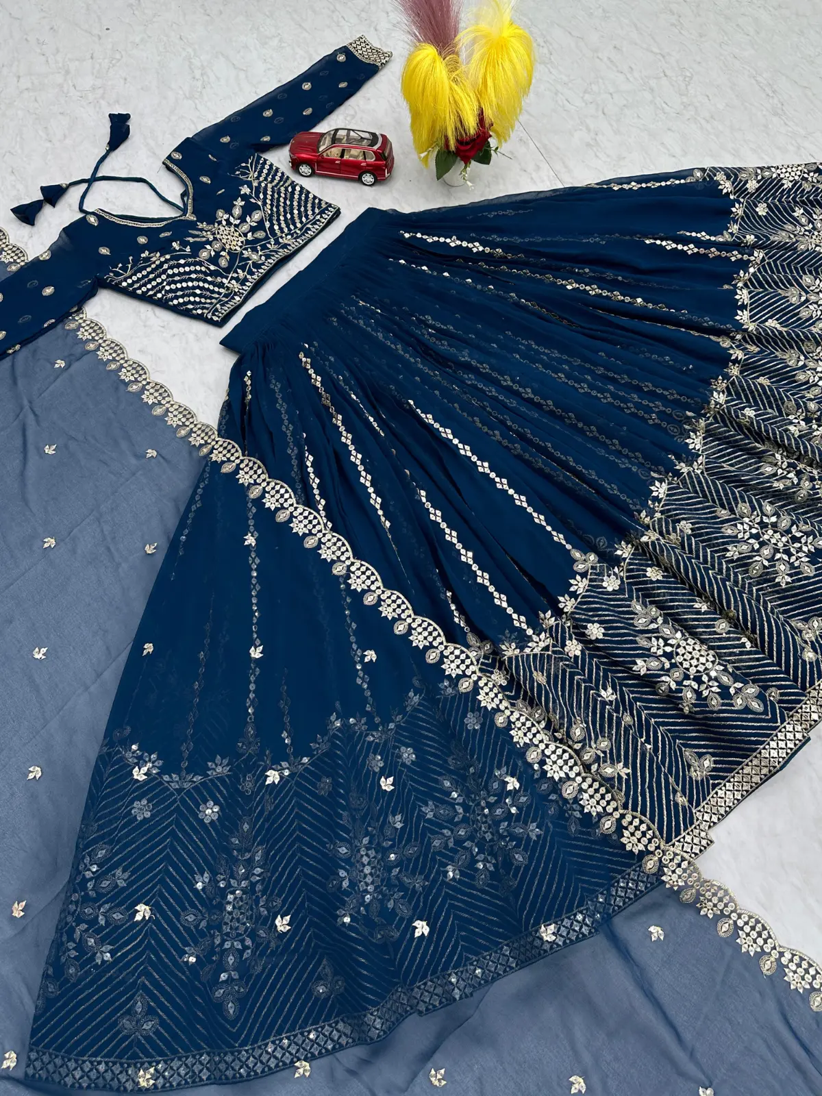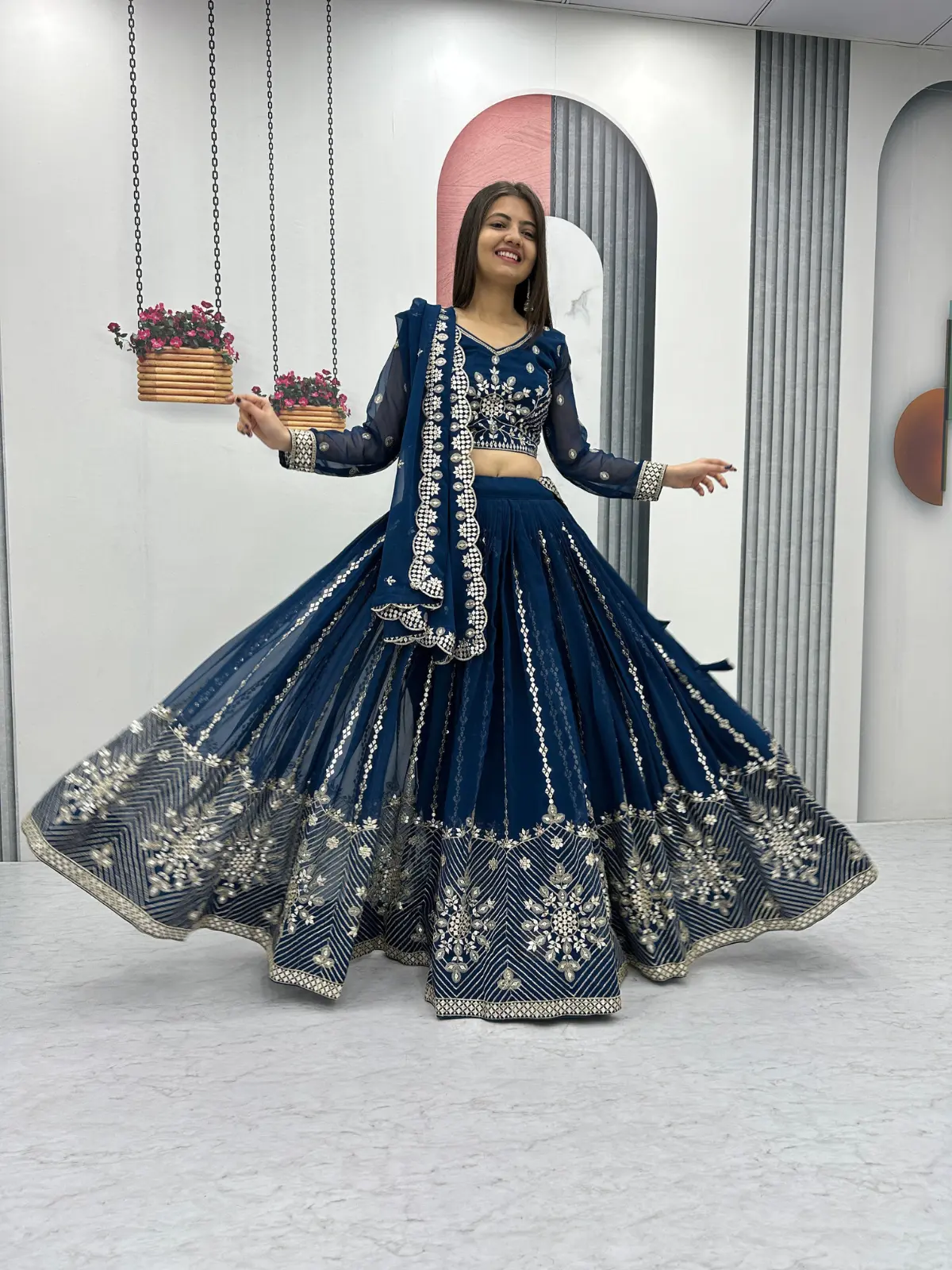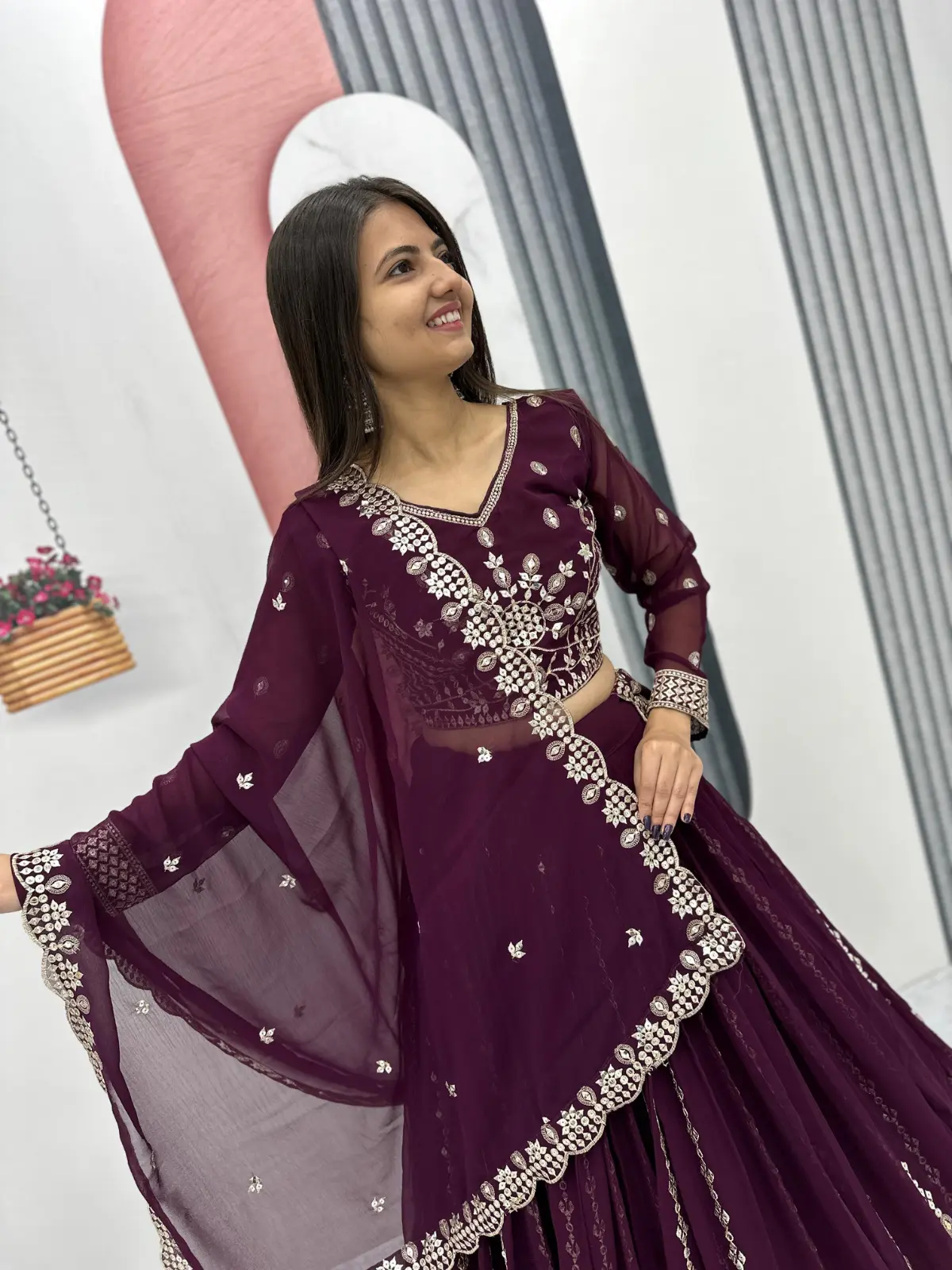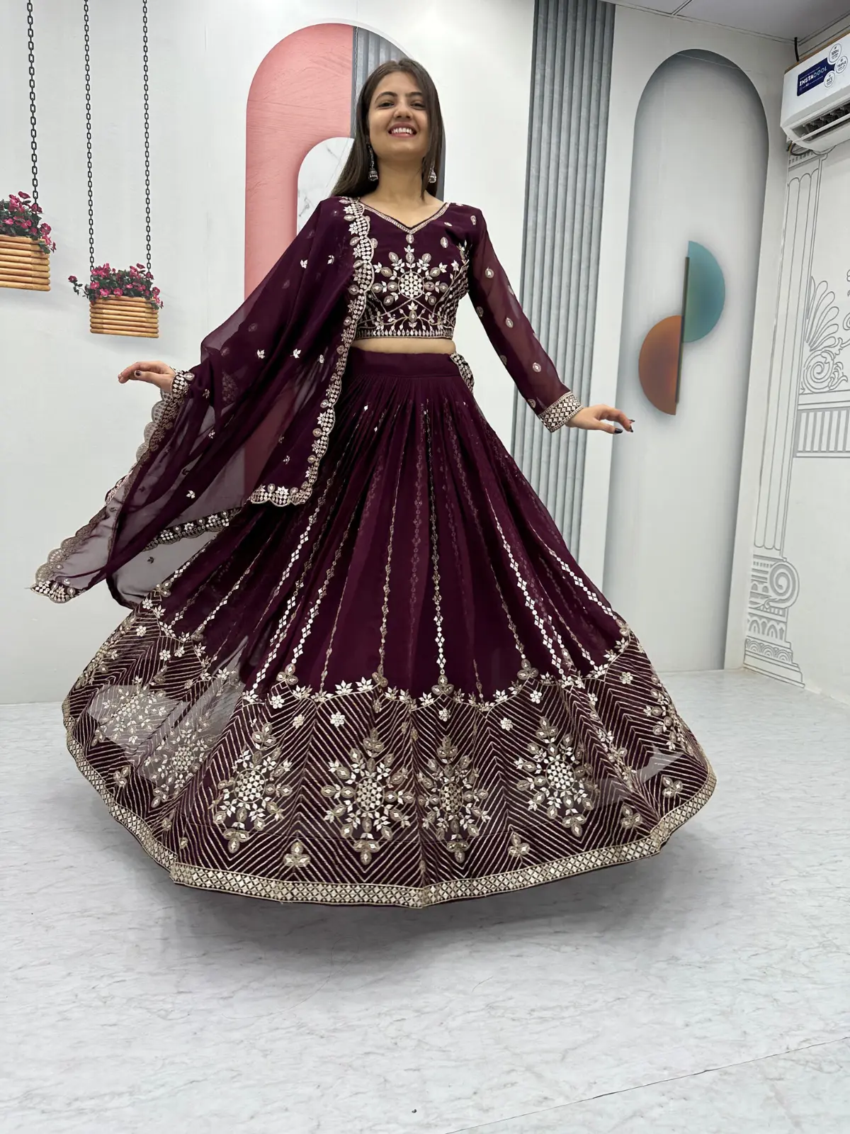 Turn heads at every celebration with this stunning embroidered lehenga choli set. Crafted in luxurious Fox Georgette and adorned with intricate 7mm sequin embroidery, this outfit delivers both premium quality and timeless style.