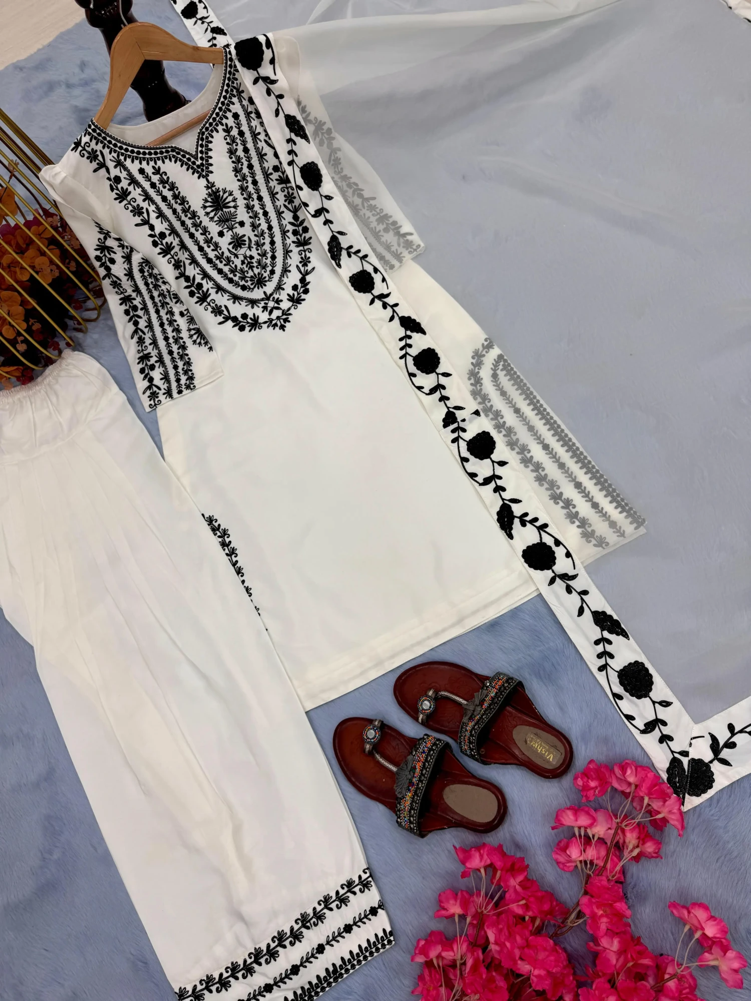 The matching plazzo is also crafted from faux georgette, with the same intricate embroidery work, micro cotton inner lining, and an elastic waistband for a perfect fit. It comes fully stitched up to size 44 with a length of 39–40 inches.