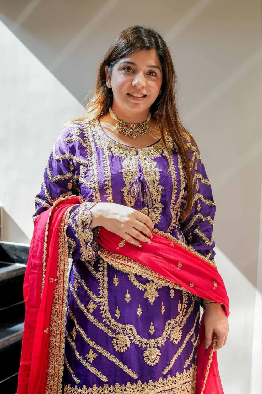 Step into elegance with this fully stitched designer ensemble, crafted from rich Chinon silk and adorned with detailed cording sequin embroidery. Perfect for festive occasions, parties, and cultural celebrations.