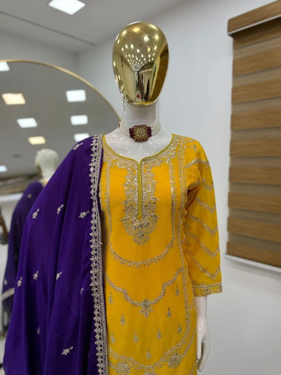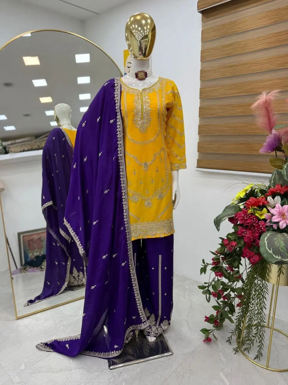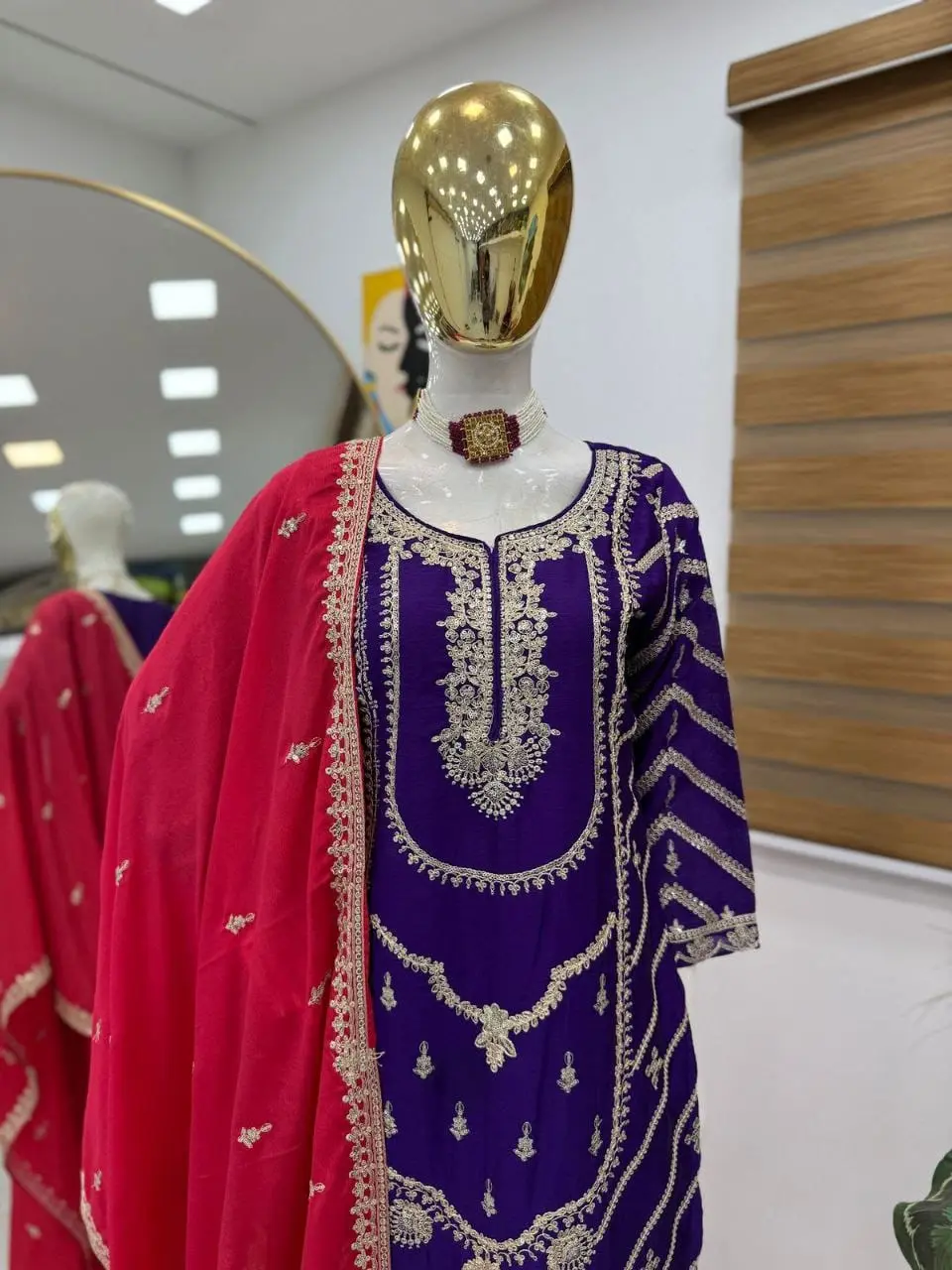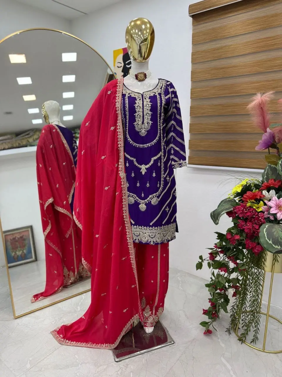 Exclusive Chinon Suit Set with Sequins Embroidery – Kurti, Plazzo & Organza Dupatta