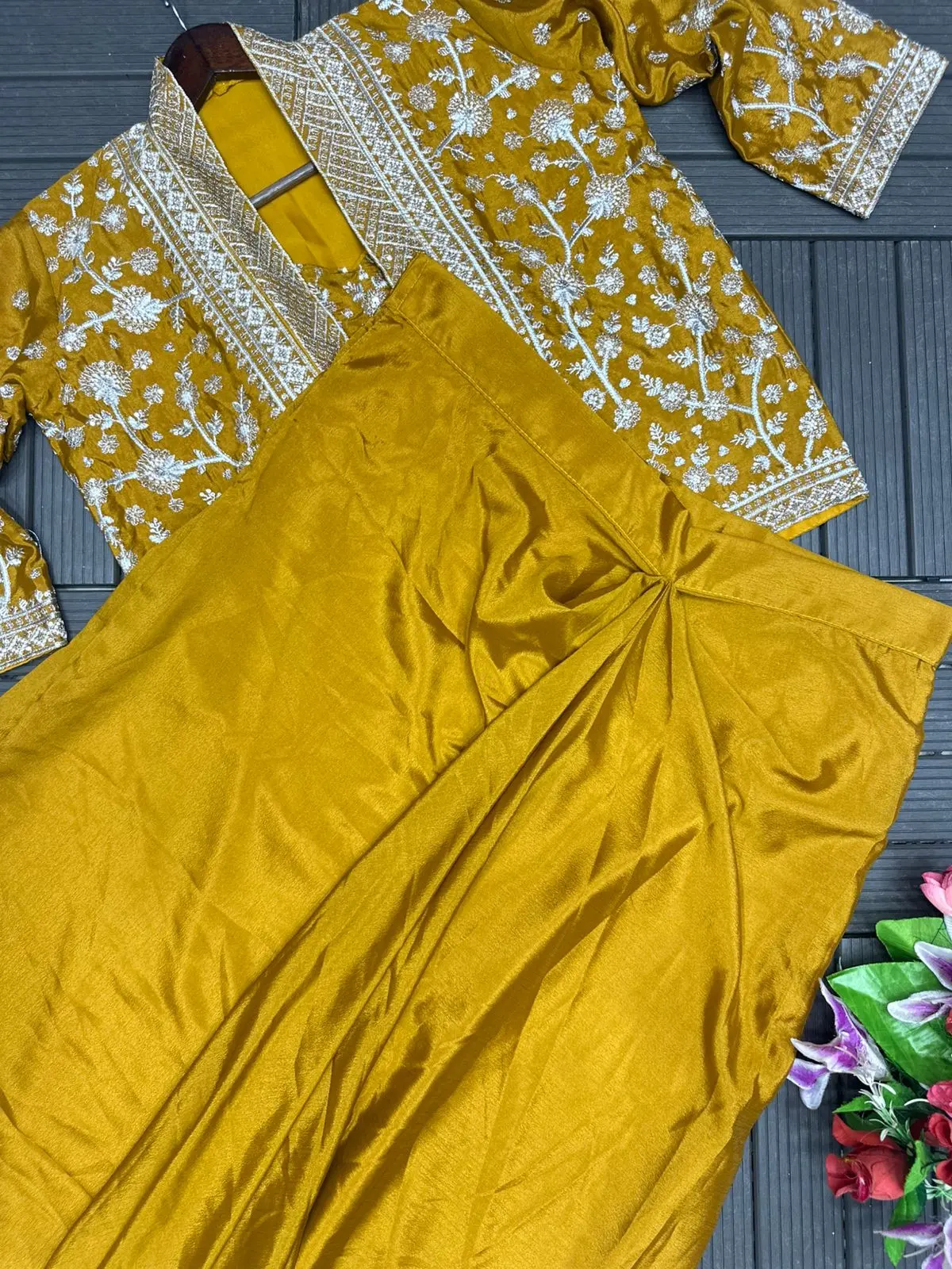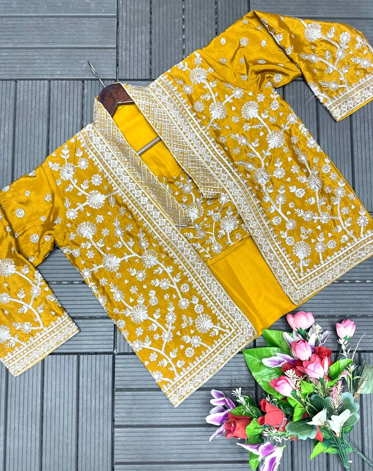 Introducing the premium designer collection WW-1203, a fully stitched and ready-to-wear set featuring a pure natural crepe satin top with embroidery work, elegant farshi, and matching dupatta. This outfit is designed for style and comfort, making it ideal for weddings, parties, receptions, and festive occasions.