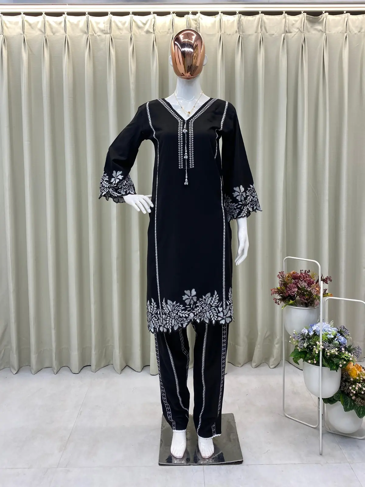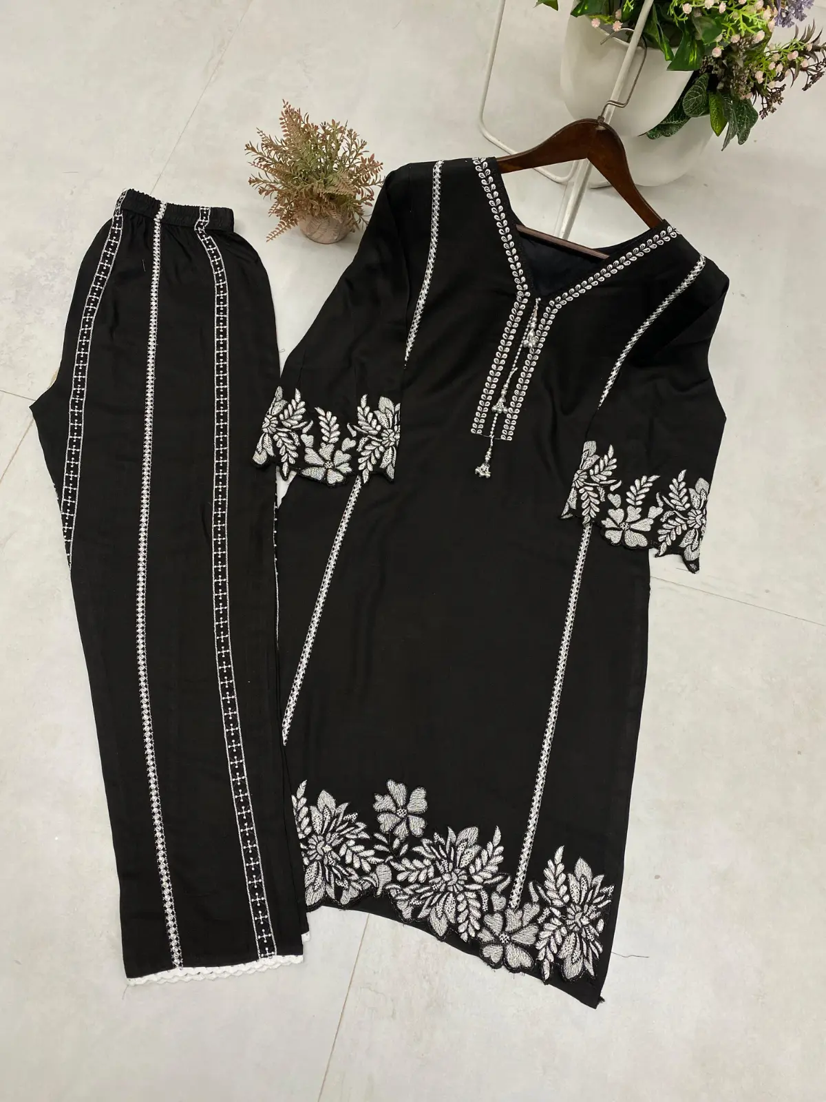Exclusive Chinon Suit Set with Sequins Embroidery – Kurti, Plazzo & Organza Dupatta